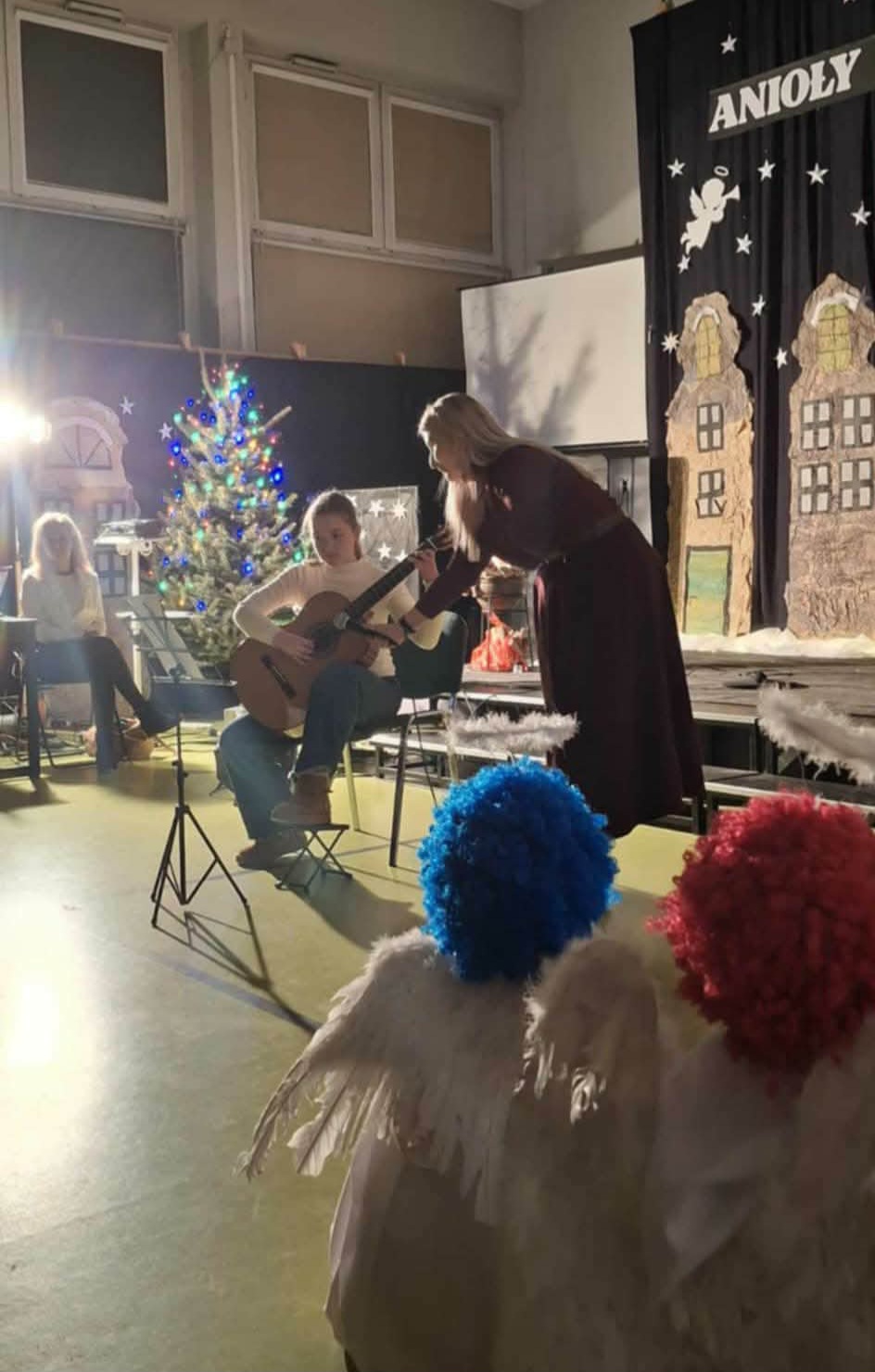 Po jasełkach uczniowie kl. 2b pokazali swoje talenty: śpiewali kolędy, Julka tańczyła, a na koniec uczennica kl. 5b, Anielka, zagrała na gitarze kolędę "Wśród nocnej ciszy".