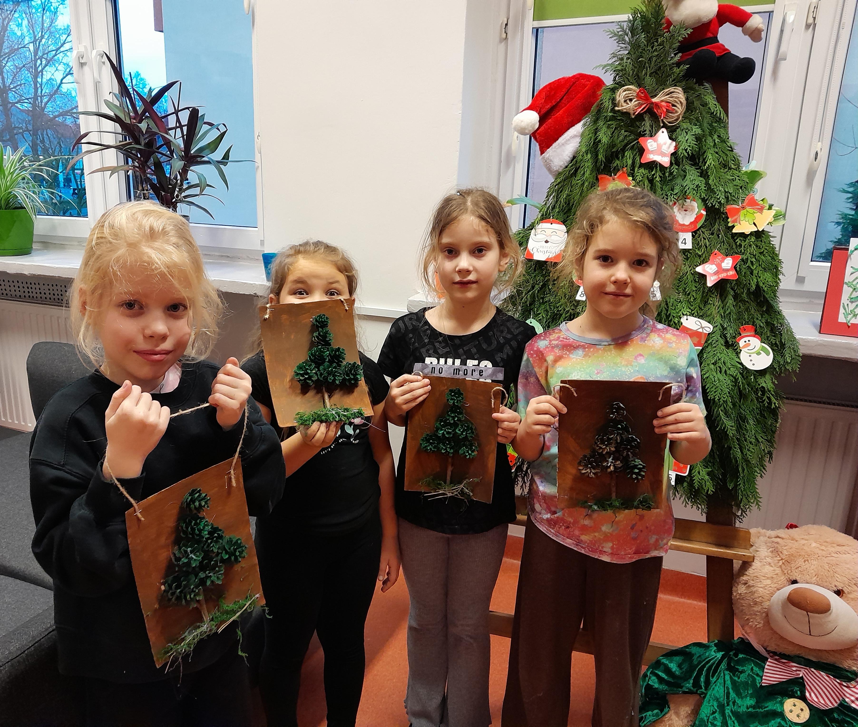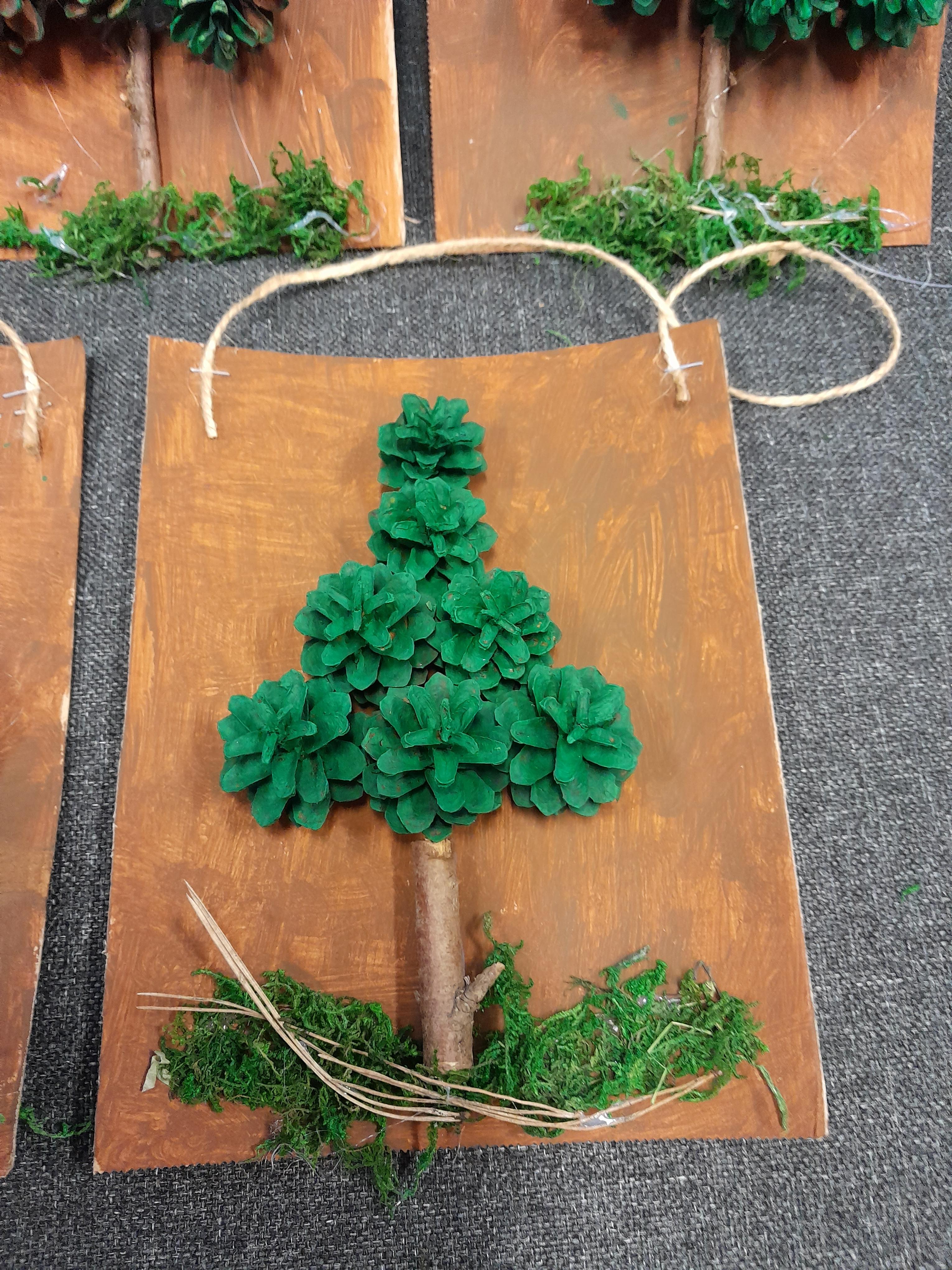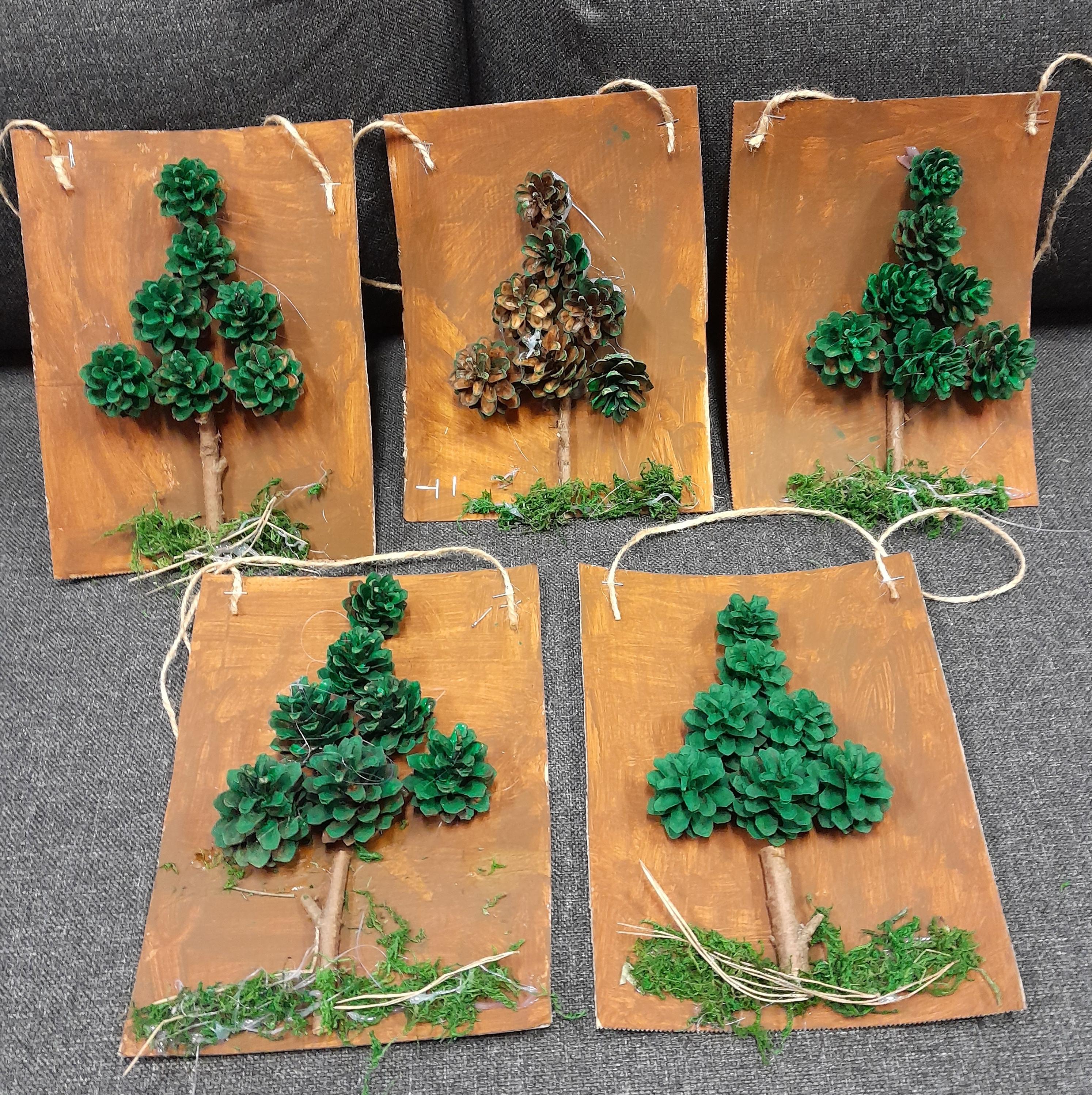 "Choinki z szyszek" - praca wykonana przez grupę Mali artyści.