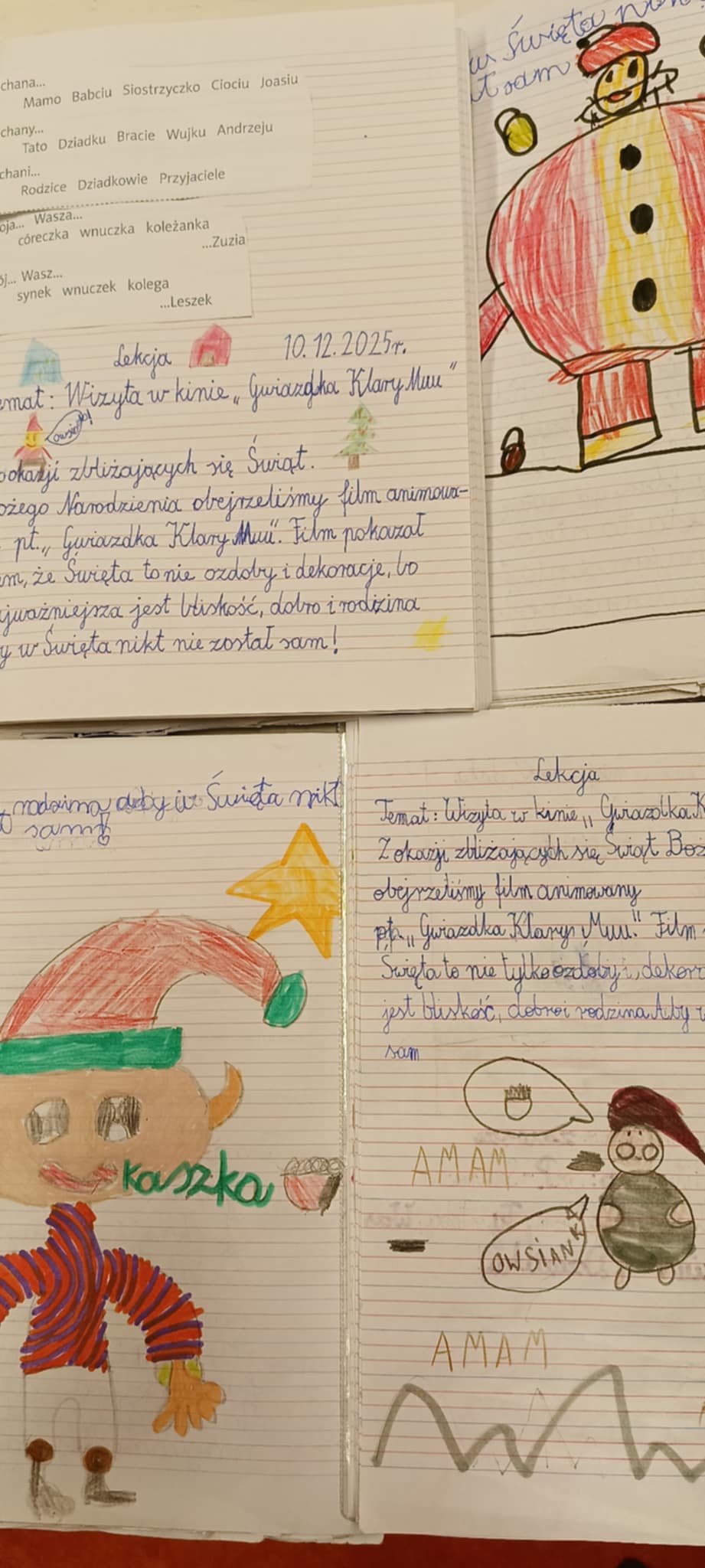 10 grudnia klasy: 1a, 2a, 2b i 3a wzięły udział w kolejnym, trzecim już, spotkaniu kinowym w ramach projektu: "Młode Horyzonty Edukacji Filmowej". Przed nami zbliżające się wielkimi krokami święta Bożego Narodzenia, więc prelekcja, wprowadzająca w atmosferę filmu, dotyczyła rodzinnych wartości i świątecznych tradycji. Mimo że film był bajkowy, barwny, animowany, a główną bohaterką krówka Klara, to niósł ze sobą bardzo ważne przesłanie, które klasa 2b zredagowała już podczas lekcji, a brzmi ono tak: "ŚWIĘTA TO NIE OZDOBY i DEKORACJE, bo NAJWAŻNIEJSZE SĄ DOBRO, BLISKOŚĆ i RODZINA i aby w ŚWIĘTA NIKT NIE BYŁ SAM".