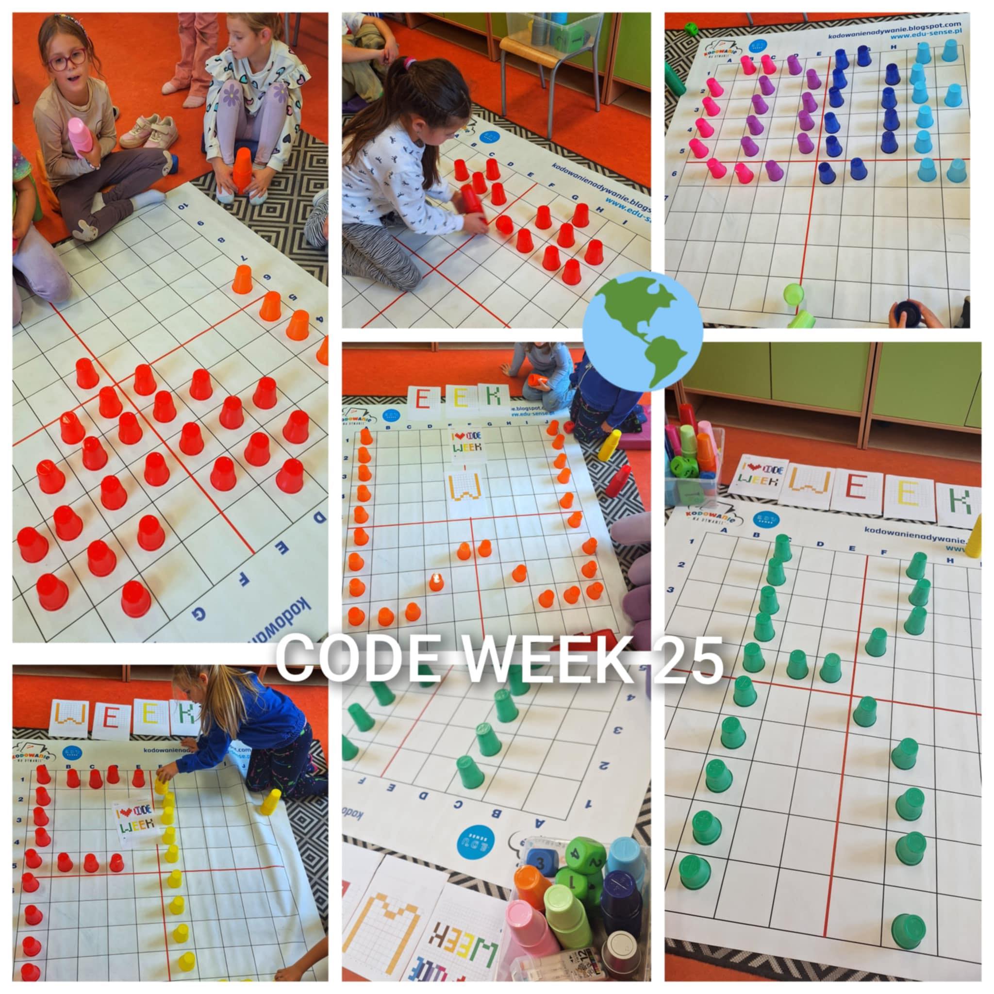 W ramach Europejskiego Tygodnia Kodowania CODE WEEK 2025 dzieci ze świetlicy przy Szkole Podstawowej im. Henryka Sienkiewicza nr 2 w Goleniowie zakodowały na macie MAXI napis CodeWeek z kolorowych kubeczków.