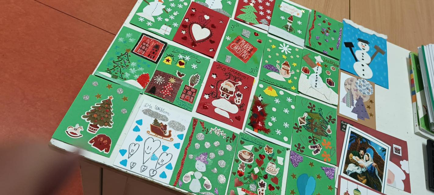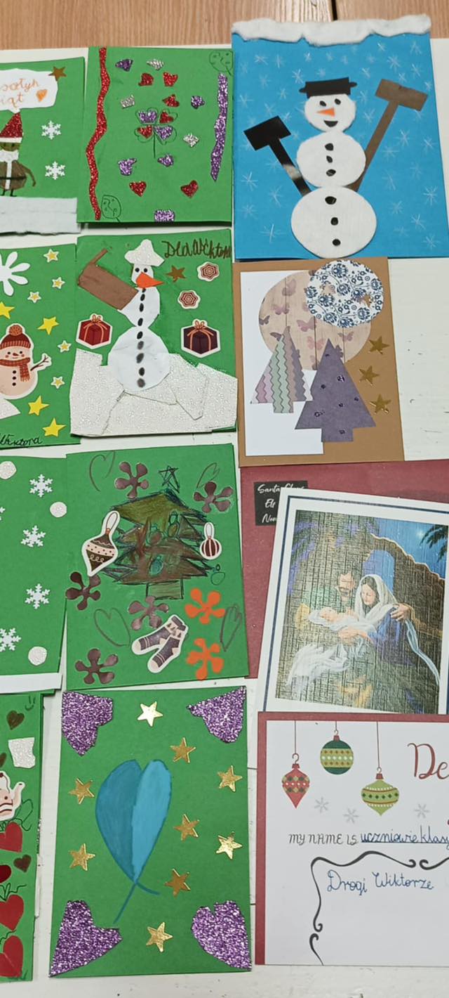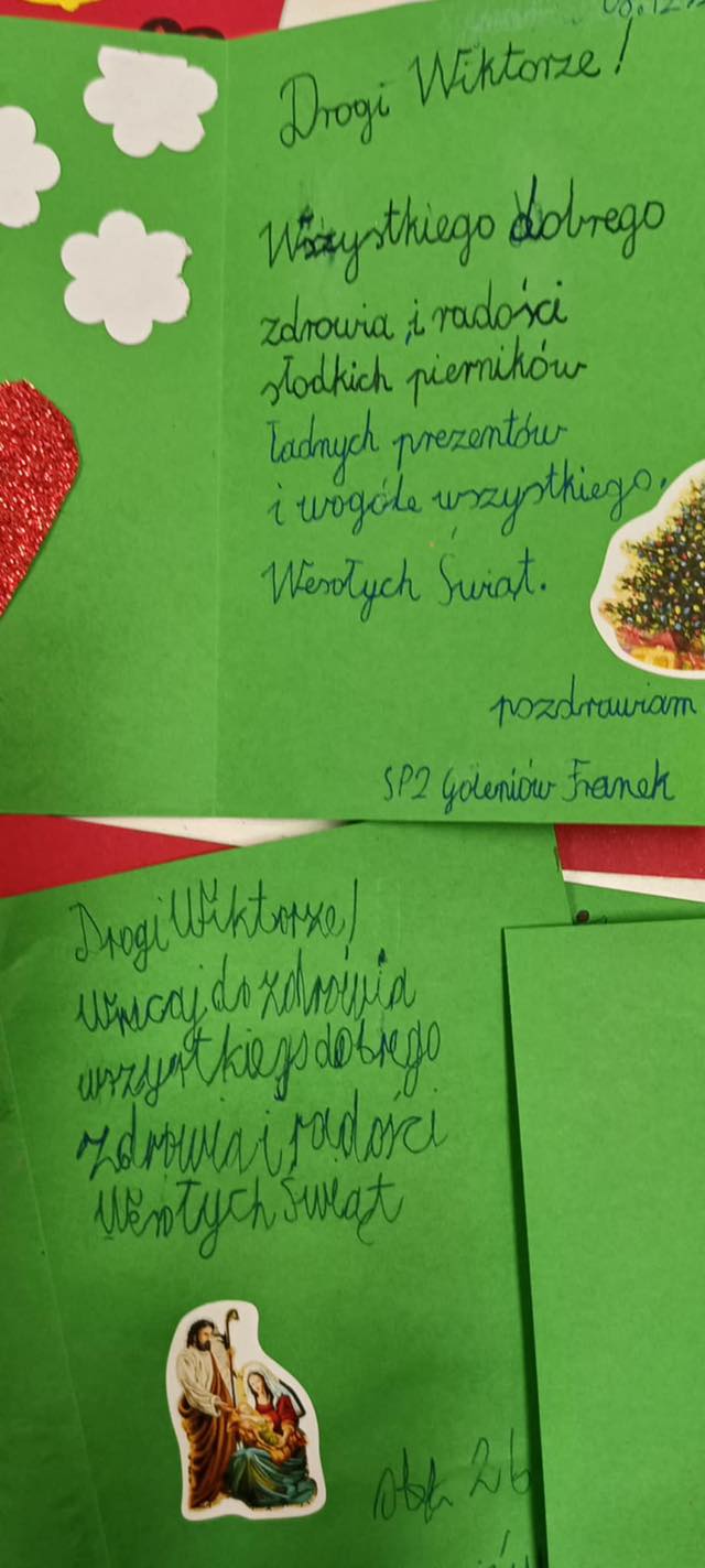 W czasie Świąt Bożego Narodzenia pięknie jest czynić więcej dobra niż zwykle i dzieci z wielką radością postanowiły się nim podzielić. Dla samotnego i ciężko chorego Wiktora leżącego w szczecińskim szpitalu, wykonały świąteczne kartki z życzeniami Dobrych Świąt Bożego Narodzenia i przede wszystkim powrotu do zdrowia. Chłopcy napisali bardziej męski list, min. o sportowych zainteresowaniach, w którym podpisała się cała klasa.