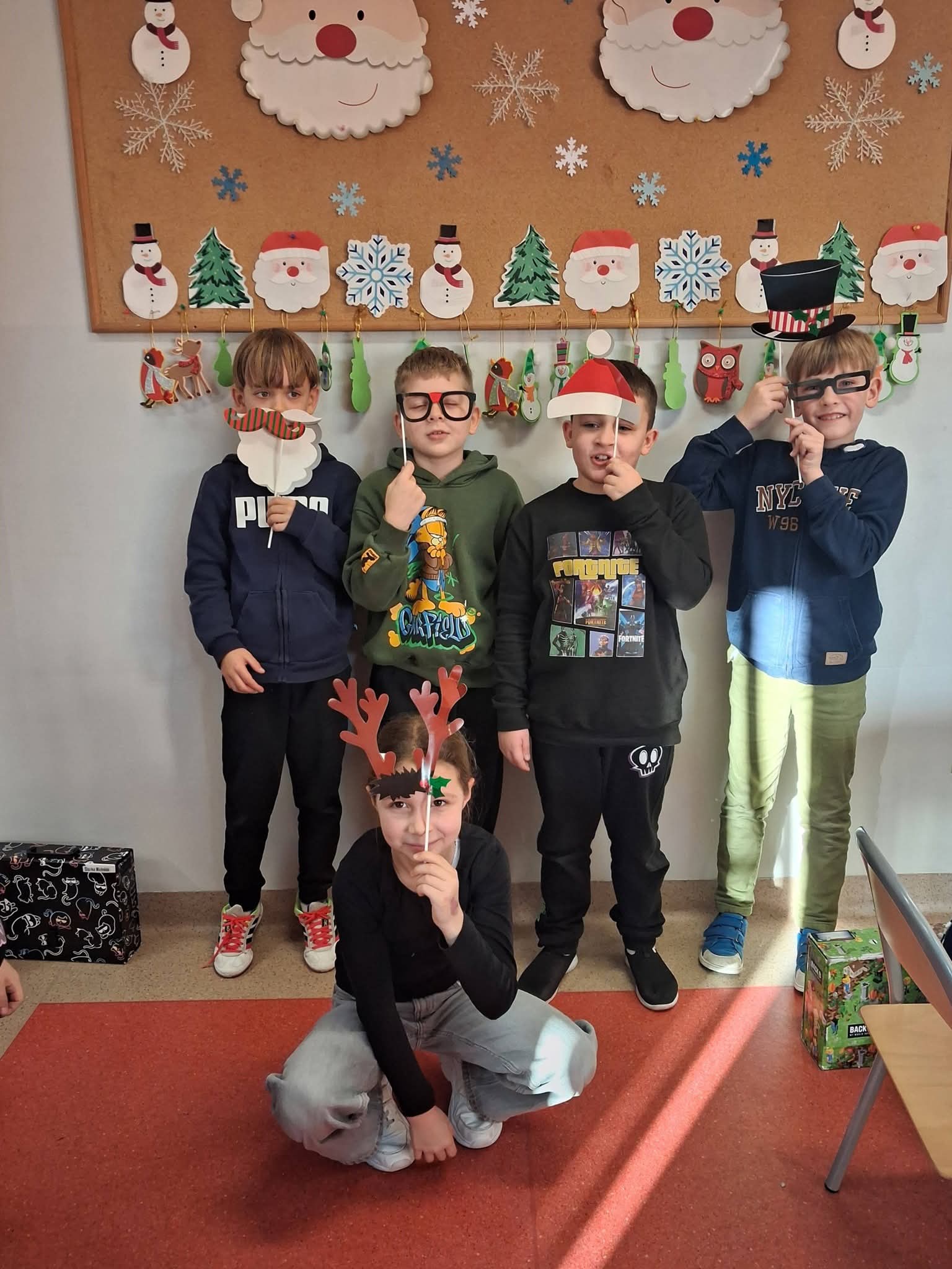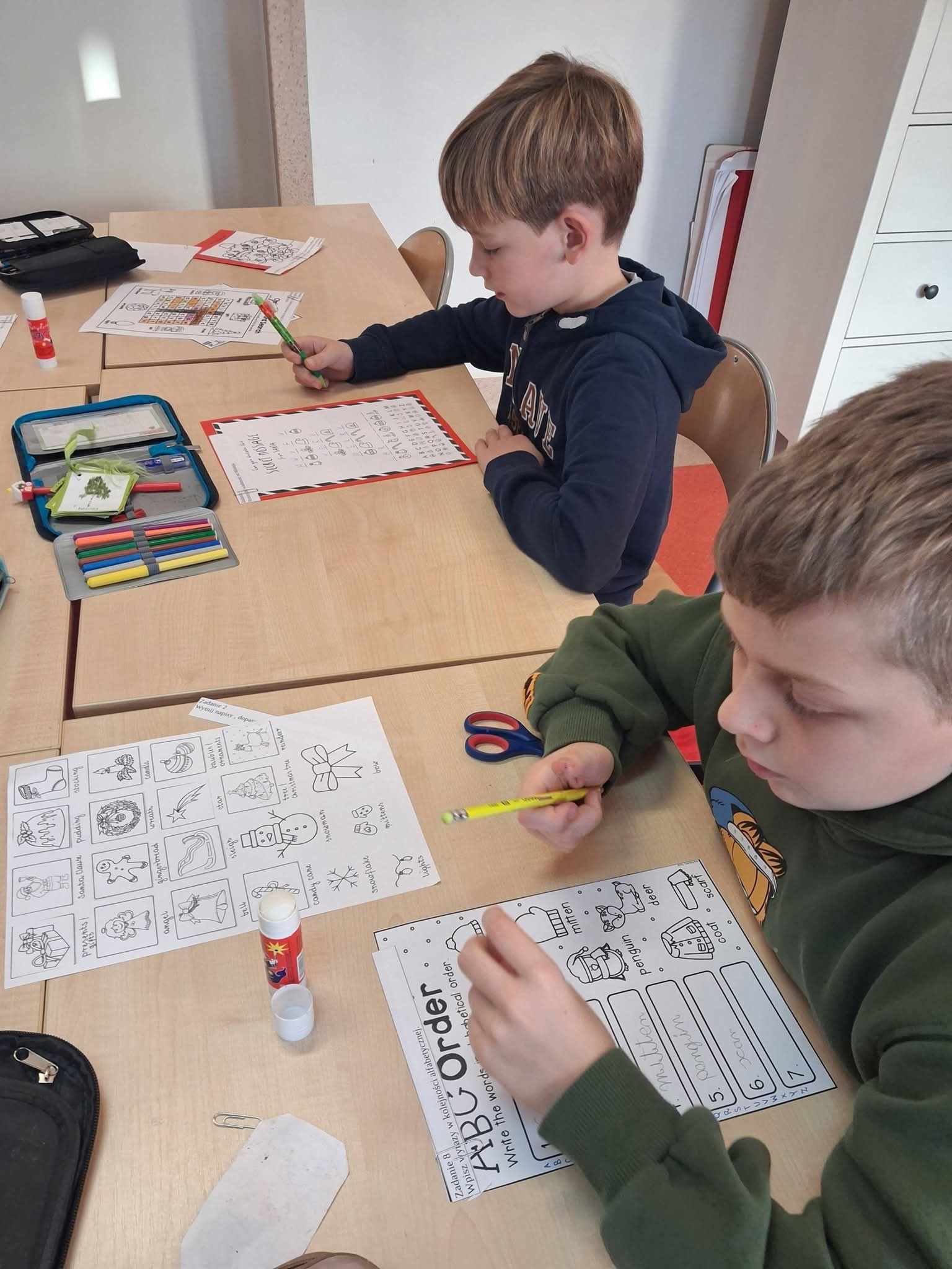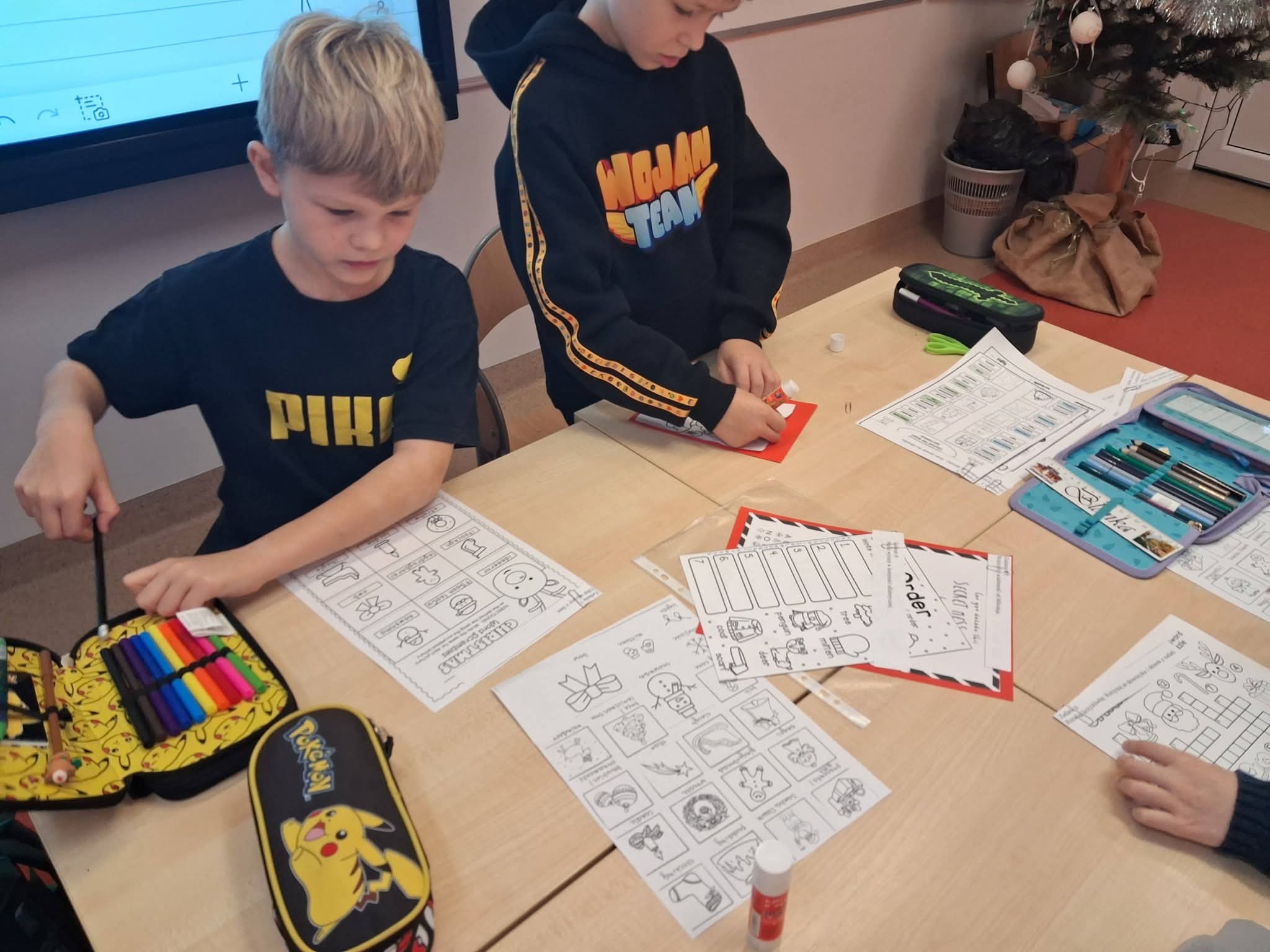 Uczniowie z klasy 2a na lekcji języka angielskiego wzięli udział w niezwykłej, świątecznej lekcji, która zamieniła salę lekcyjną w warsztat pomocników Mikołaja.