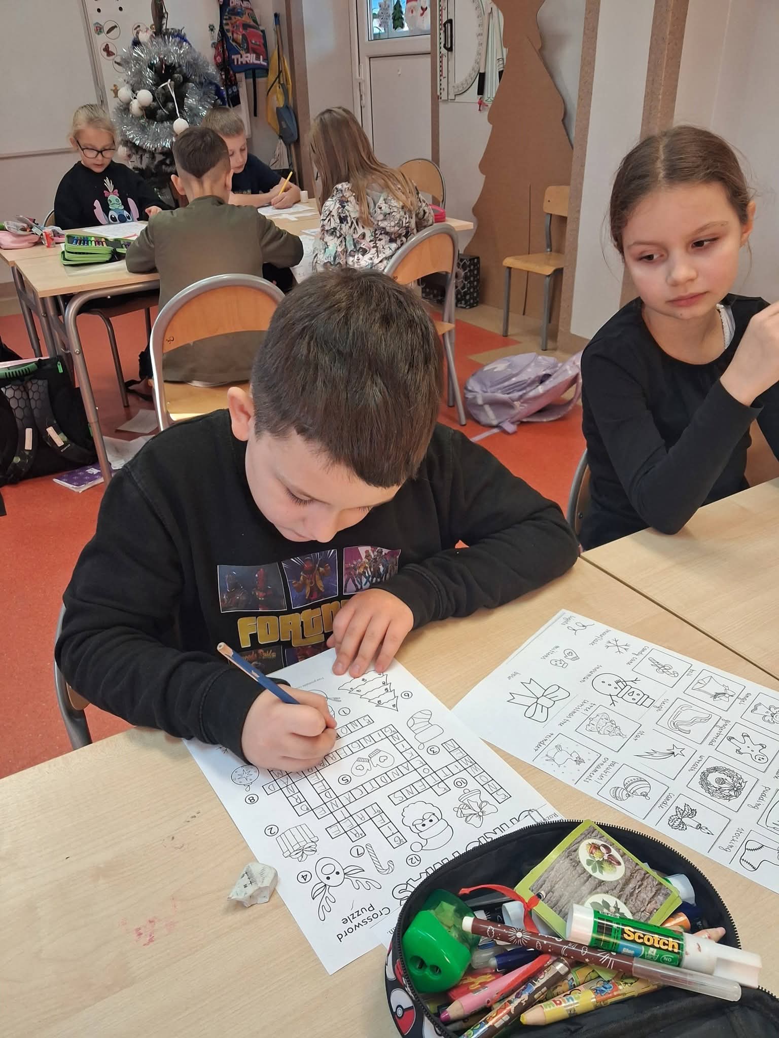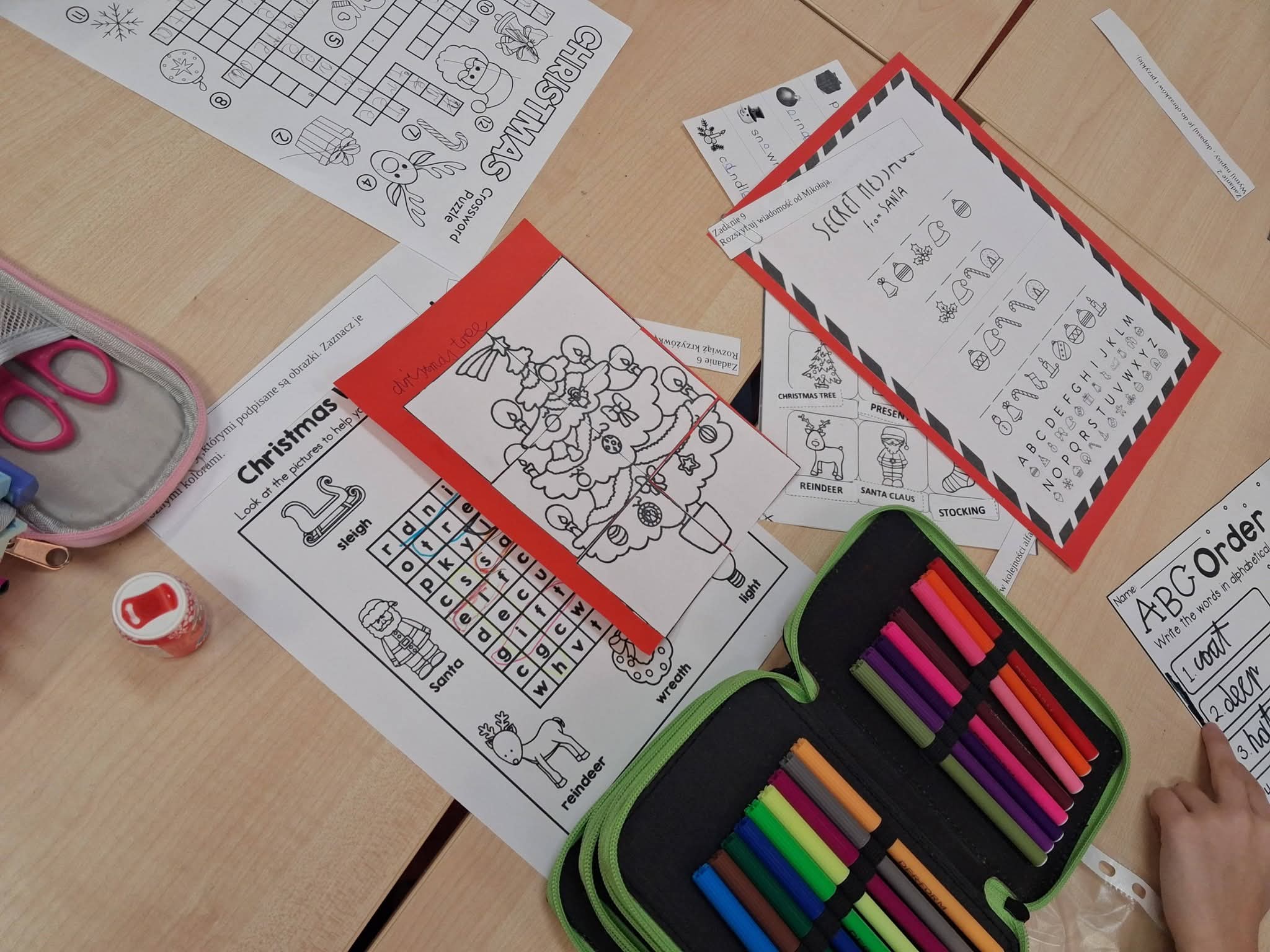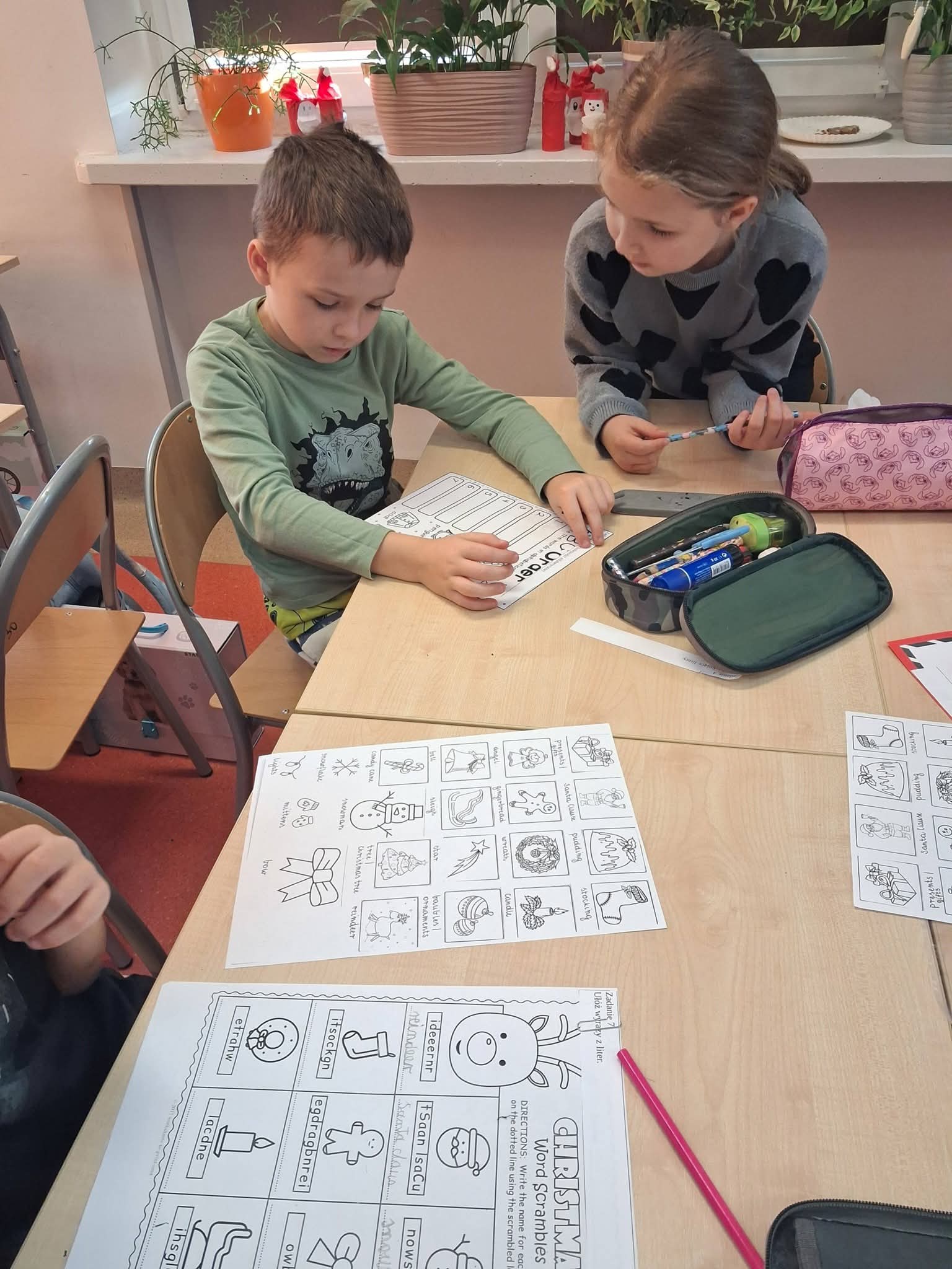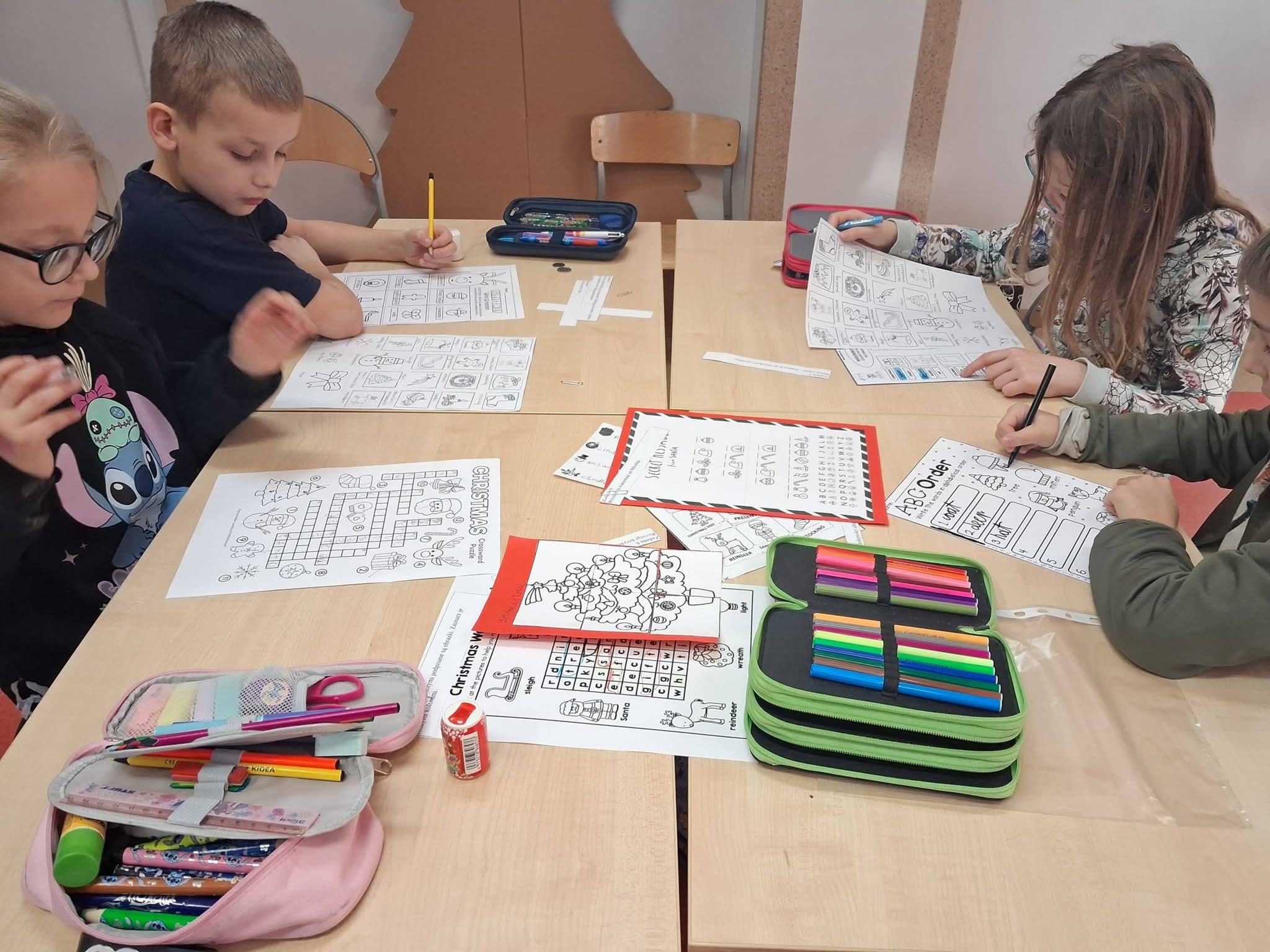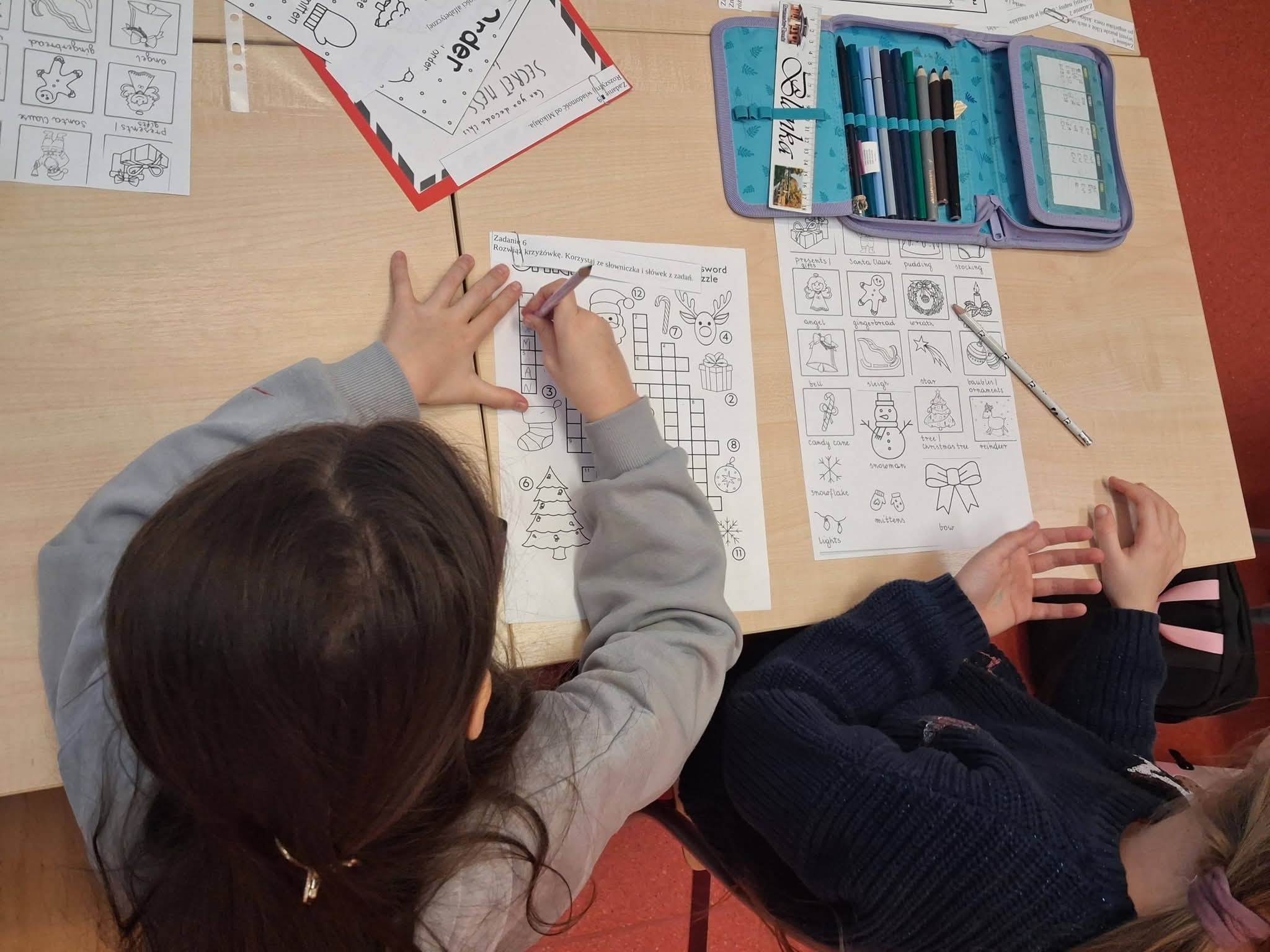 Dzieci, pracując w pełnych zaangażowania zespołach, miały do wykonania serię świątecznych zadań: rozwiązywały tematyczne krzyżówki i wykreślanki, a także układały rozsypanki literowe, tworząc angielskie słówka związane ze Świętami.