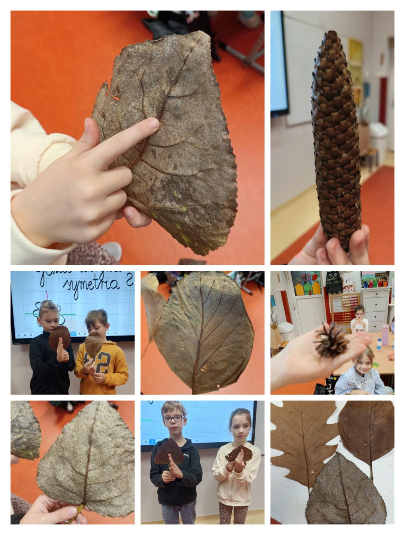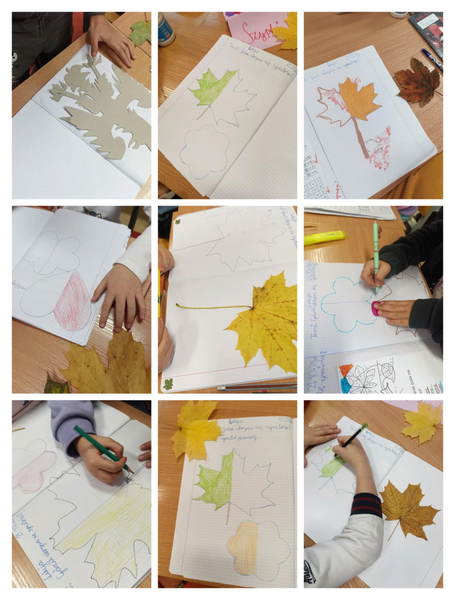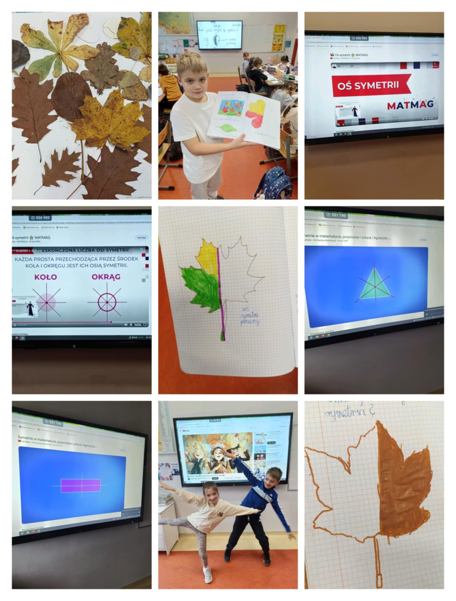Klasa 2b jest przekonana, że matematyka króluje w świecie przyrody, po jesiennej wycieczce i lekcji o drzewach postanowiła sprawdzić, gdzie ukrywa się symetria. Wielu uczniów znało już to pojęcie i doskonale je wyjaśniło na wielu przykładach. Wiele satysfakcji dało drugoklasistom odrysowywanie konturów zasuszonych liści, szablonów kwiatów i z pomocą linijki wyznaczanie osi symetrii pionowej i poziomej.