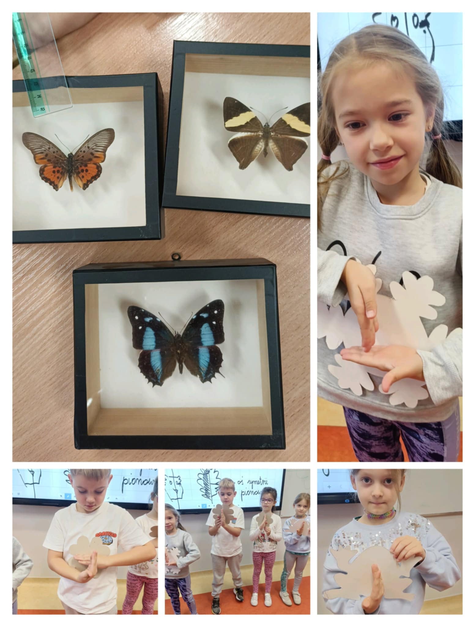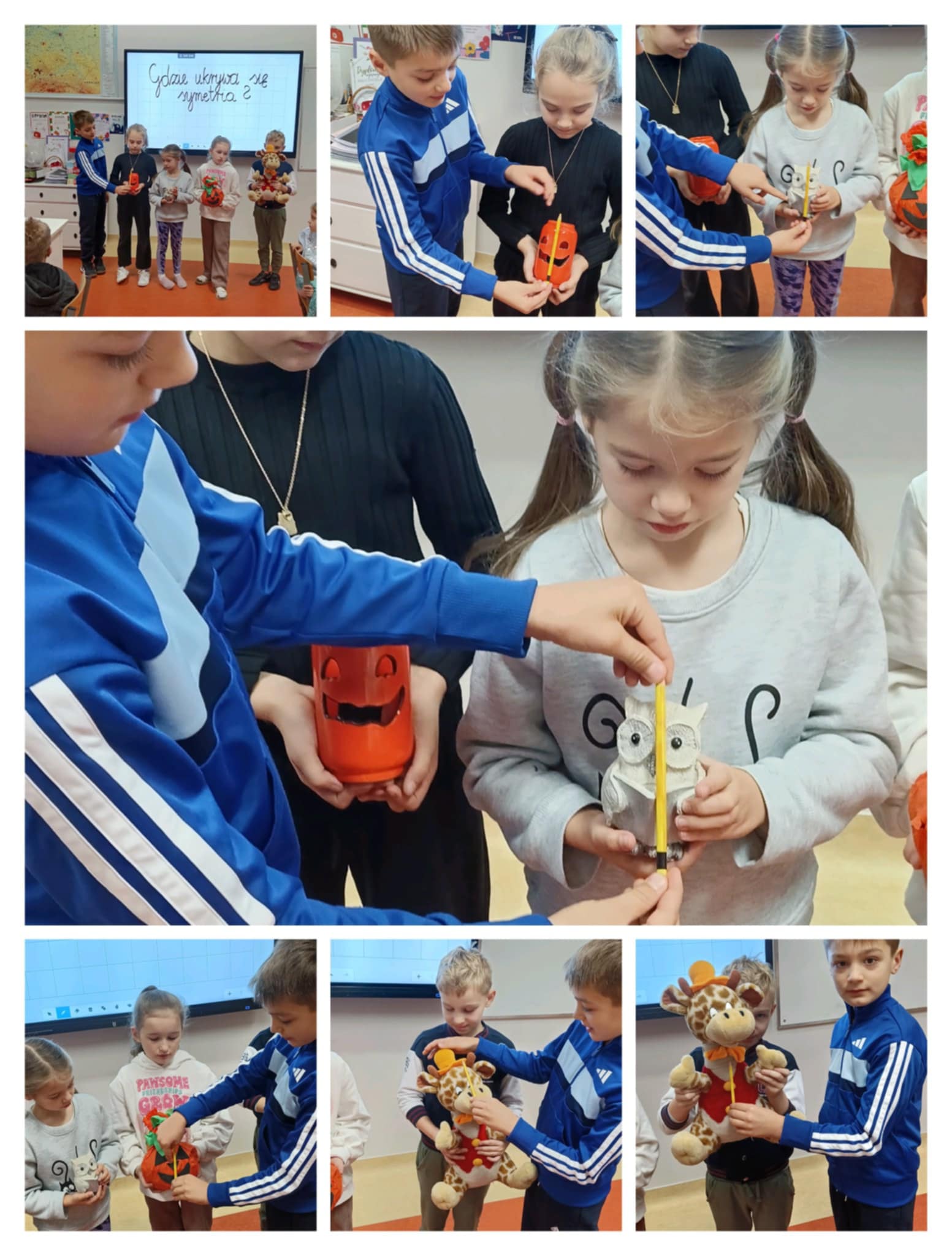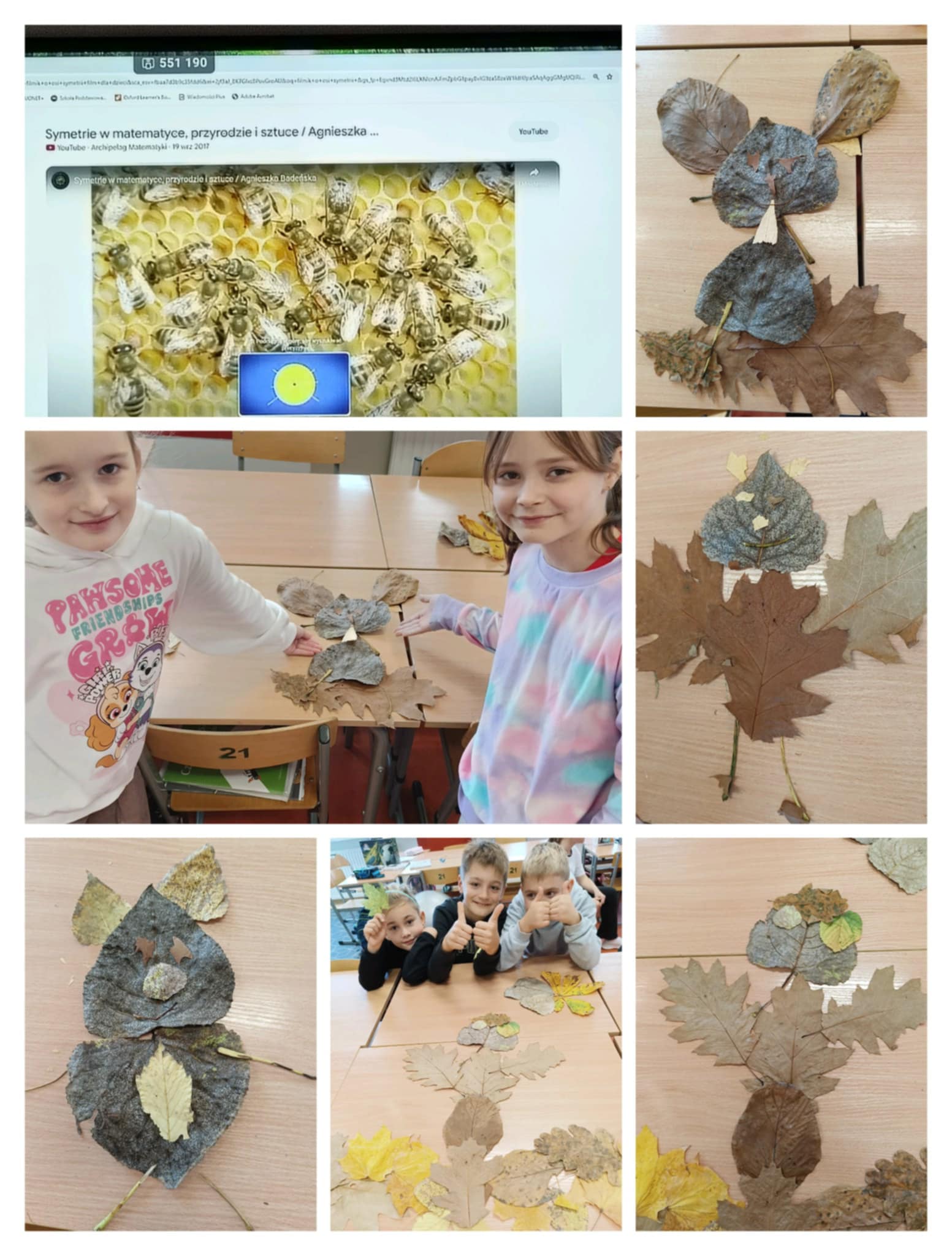 Klasa 2b jest przekonana, że matematyka króluje w świecie przyrody, po jesiennej wycieczce i lekcji o drzewach postanowiła sprawdzić, gdzie ukrywa się symetria. Wielu uczniów znało już to pojęcie i doskonale je wyjaśniło na wielu przykładach. Wiele satysfakcji dało drugoklasistom odrysowywanie konturów zasuszonych liści, szablonów kwiatów i z pomocą linijki wyznaczanie osi symetrii pionowej i poziomej.