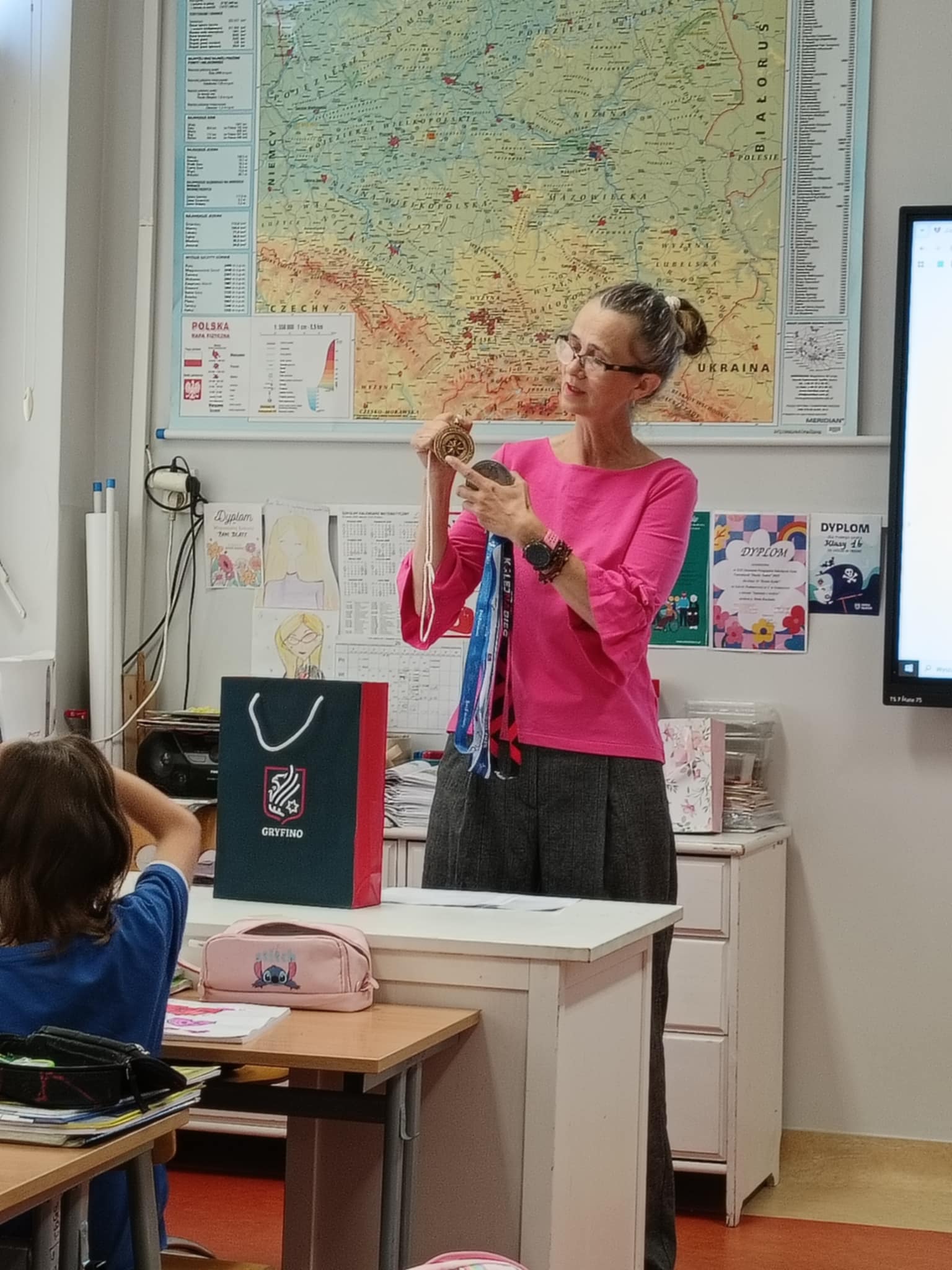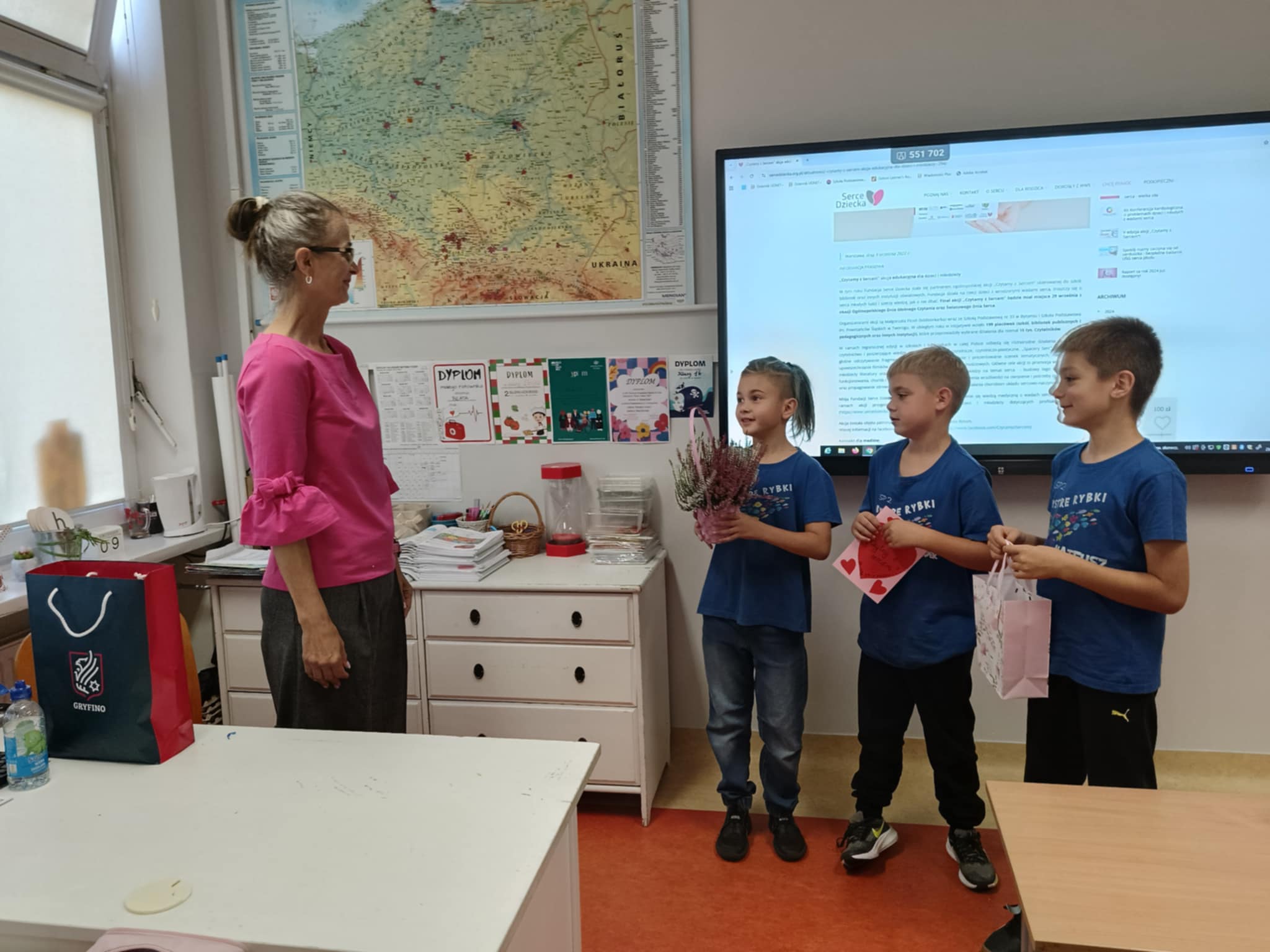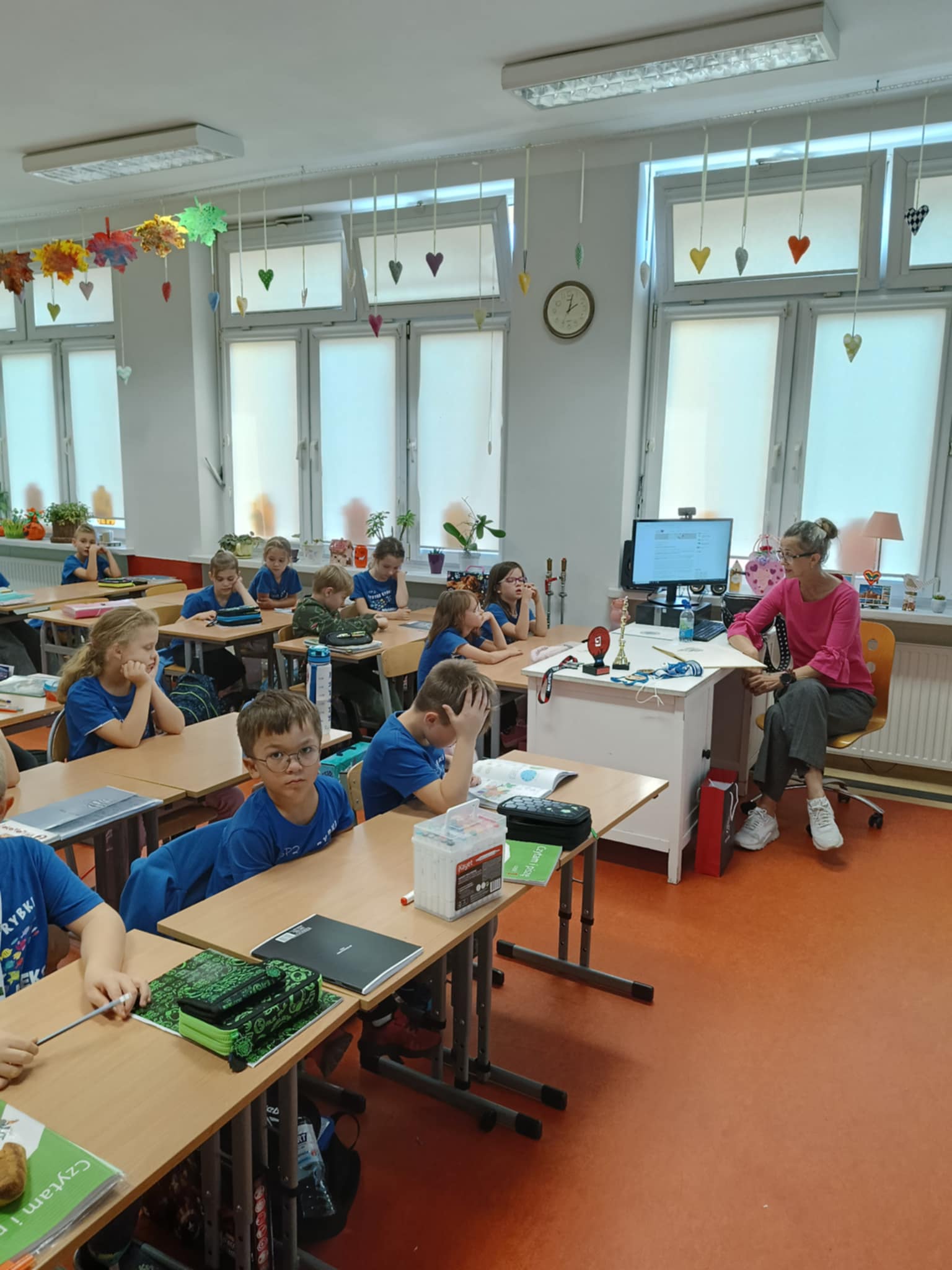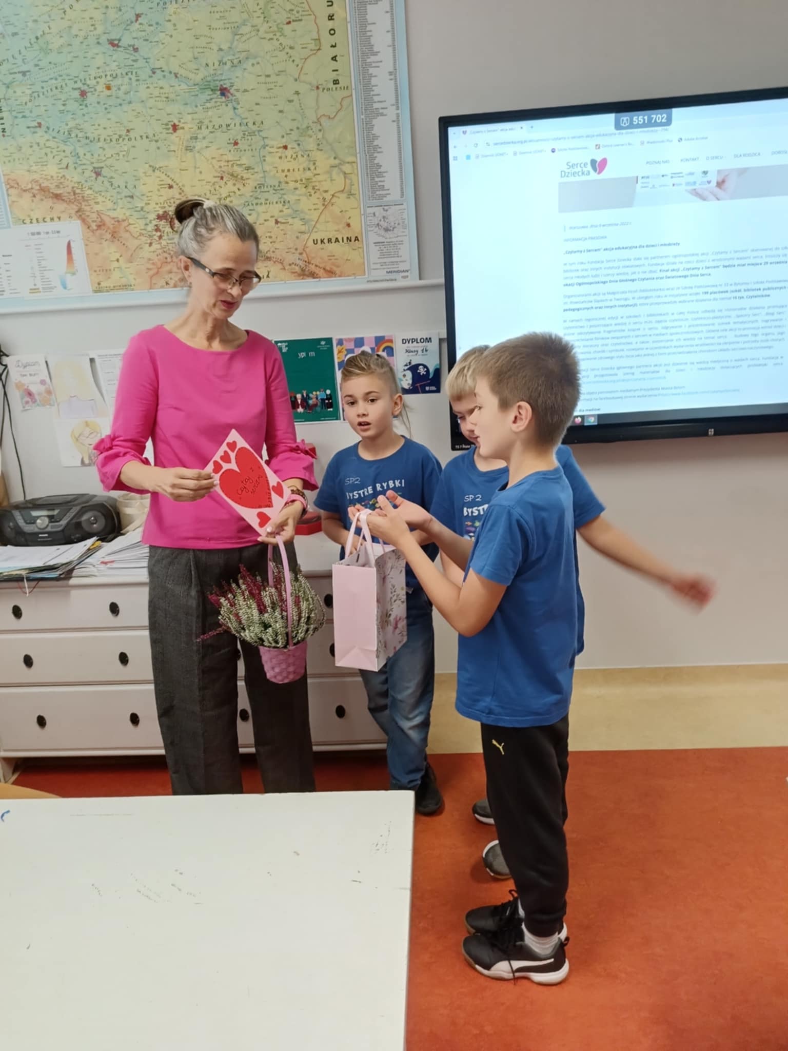 Pani Renata biega na 10 km i w maratonach, uczestniczy w zawodach w całej Polsce. Podzieliła się z dziećmi swoją wielką pasją i miłością do sportu, rocznie uczestniczy w około 140 imprezach biegowych, także w biegach charytatywnych na rzecz dzieci i osób z autyzmem. Pokazała ona dzieciom wybrane z licznej kolekcji nagrody i medale. Nauczyła też, jak się mierzy puls i "Czytała z sercem ". Klasa 2b włączyła się bowiem w V Edycję Ogólnopolskiej Akcji "Czytamy z Sercem". Na lekcji Pani Renata przeczytała uczniom idealnie dobrane opowiadanie o sercu, które także jest symbolem miłości i pomocy. Dzieci były bardzo poruszone cichym, nocnym poświęceniem chłopca dla taty i rodziny, tym bardziej, że bohater robił to z narażeniem zdrowia i wyników w nauce. Było to na pewno owocne, pouczające i miłe spotkanie. Dziękujemy Pani, Pani Renato!