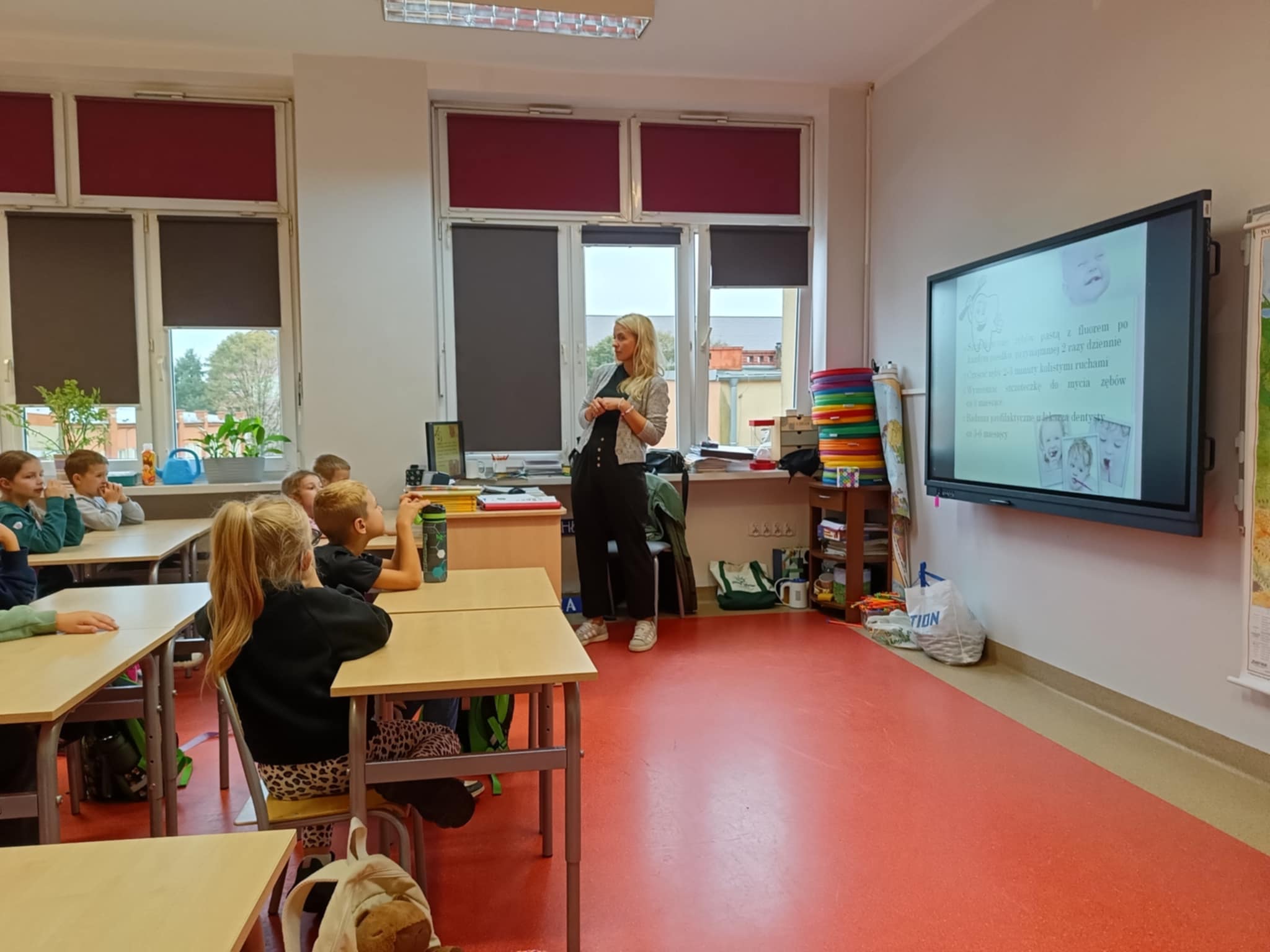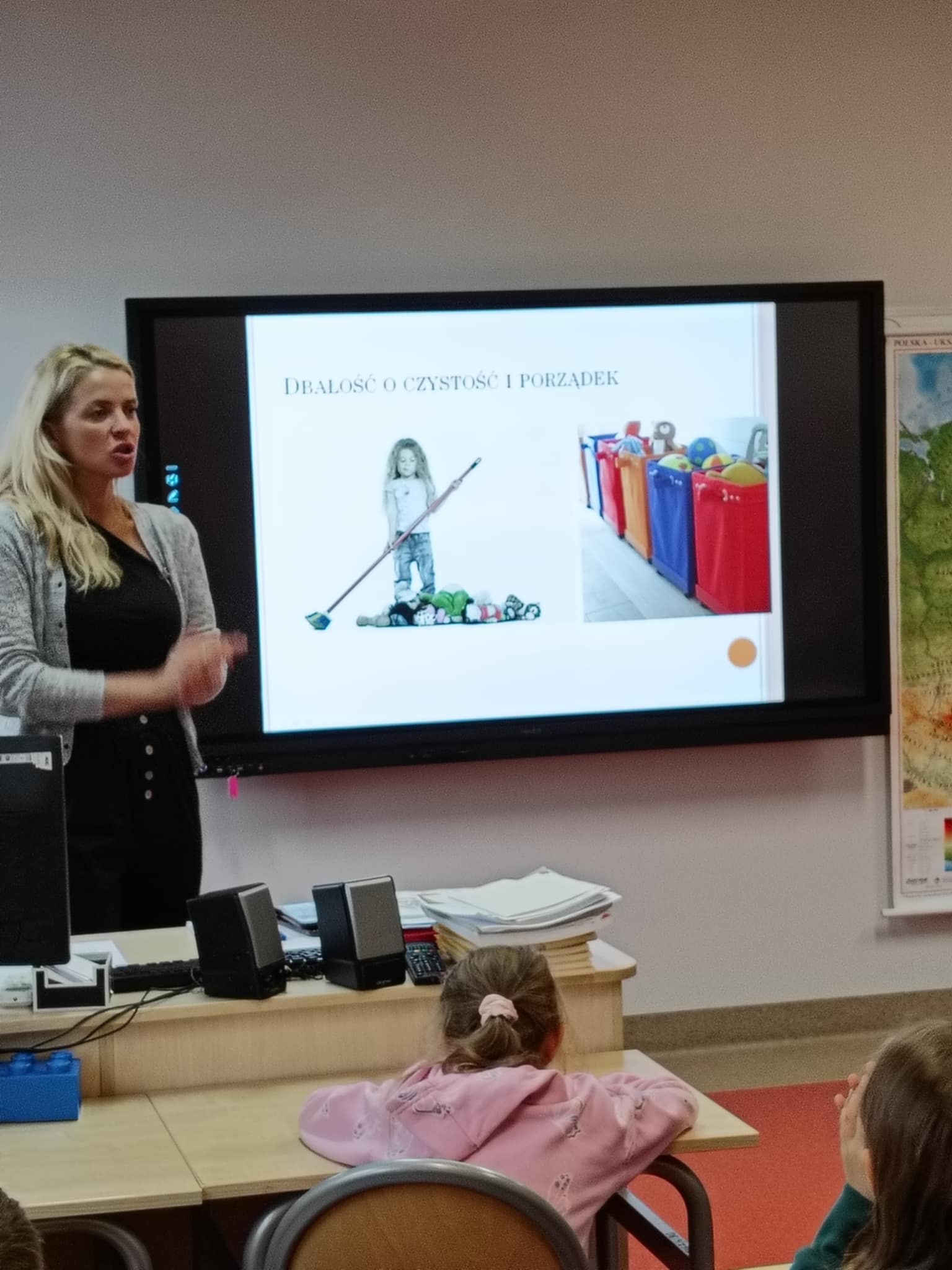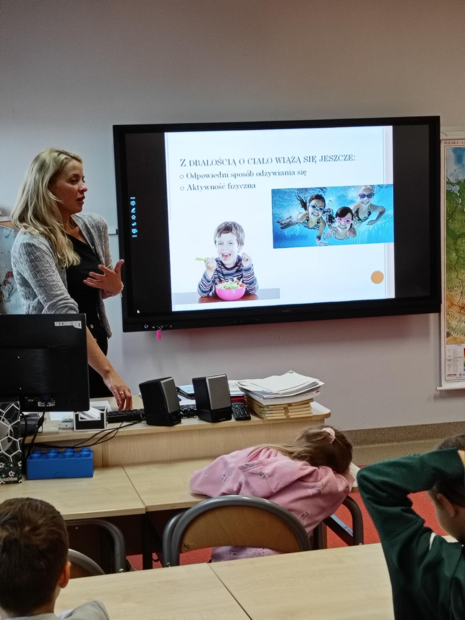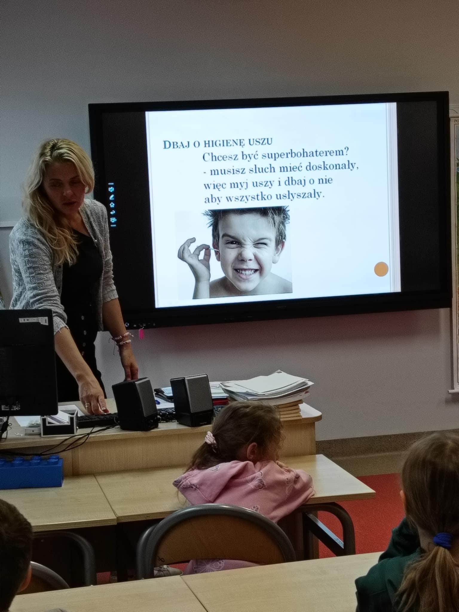 W piątek odwiedziła uczniów klas I-II pani Monika Pyzik, edukatorka z Powiatowej Stacji Sanitarno-Epidemiologicznej w Goleniowie. Z wykorzystaniem ciekawej prezentacji pani Monika przeprowadziła z dziećmi rozmowę na temat utrwalania bardzo ważnych zasad higieny osobistej, zarówno tej w domu, jaki i tej w szkole, czy na basenie oraz szeroko pojętych zdrowych nawyków żywieniowych, odpowiedniego stylu życia, długości snu, codziennego ruchu, tak ważnych dla rozwoju każdego dziecka.