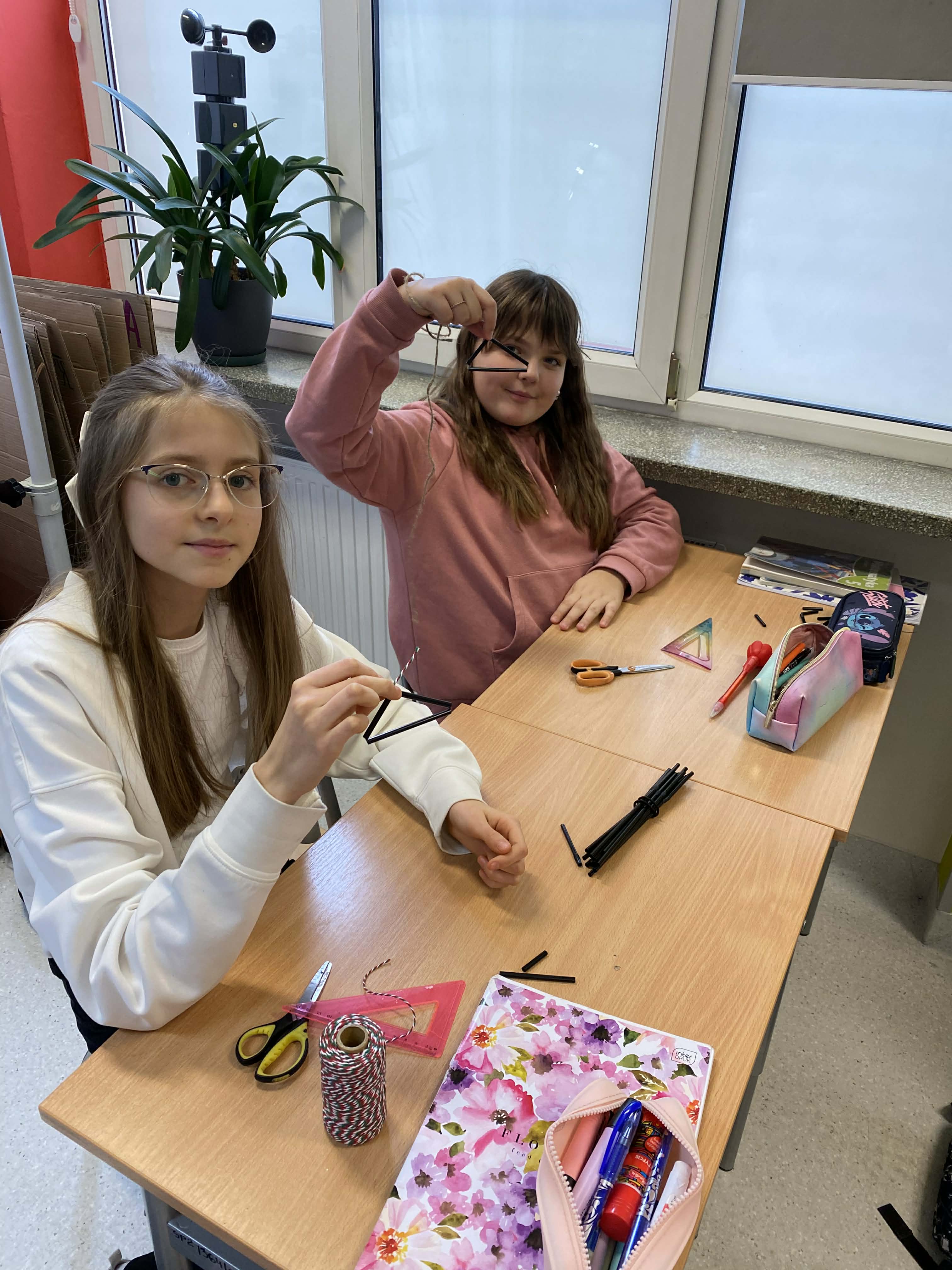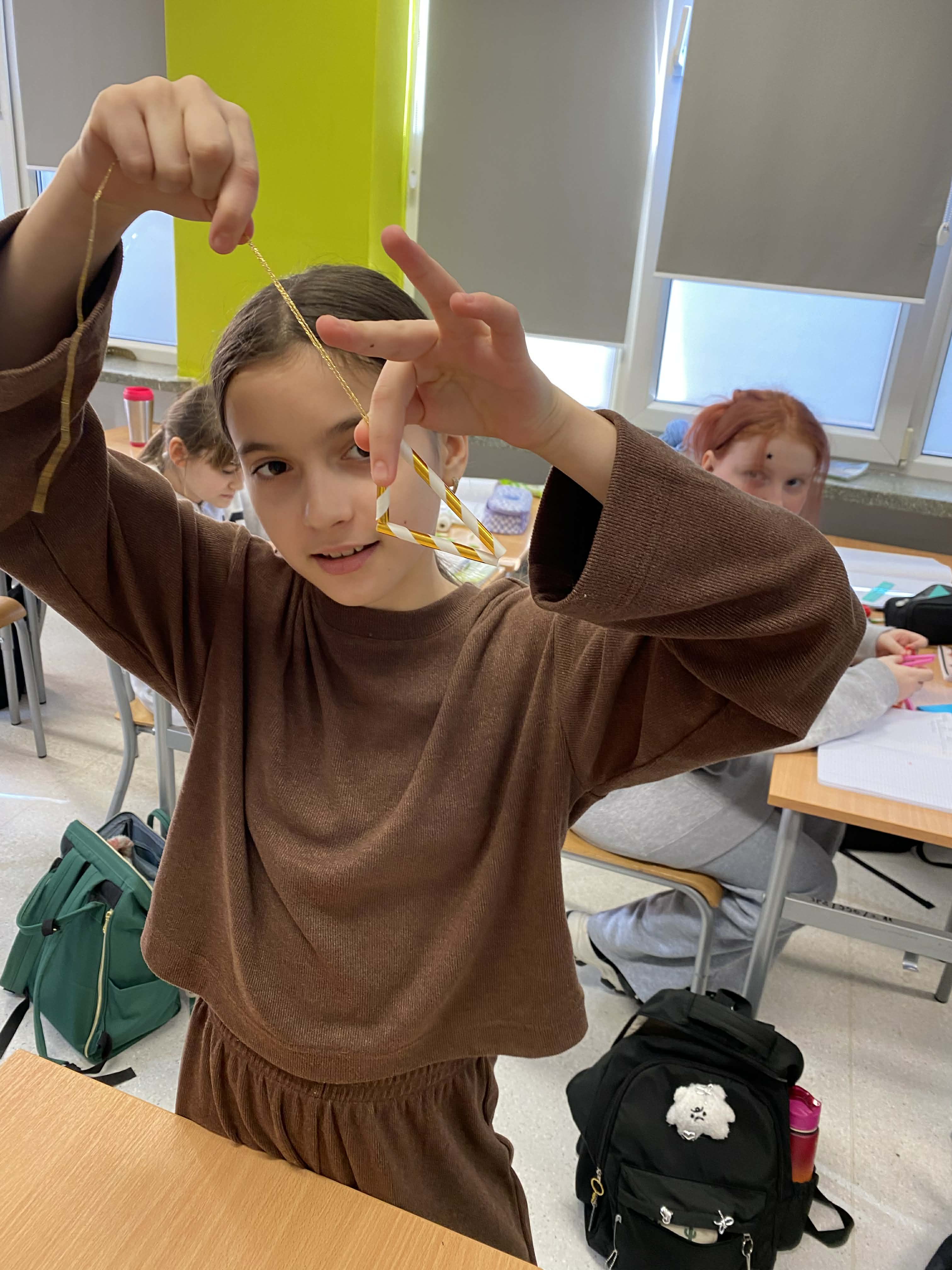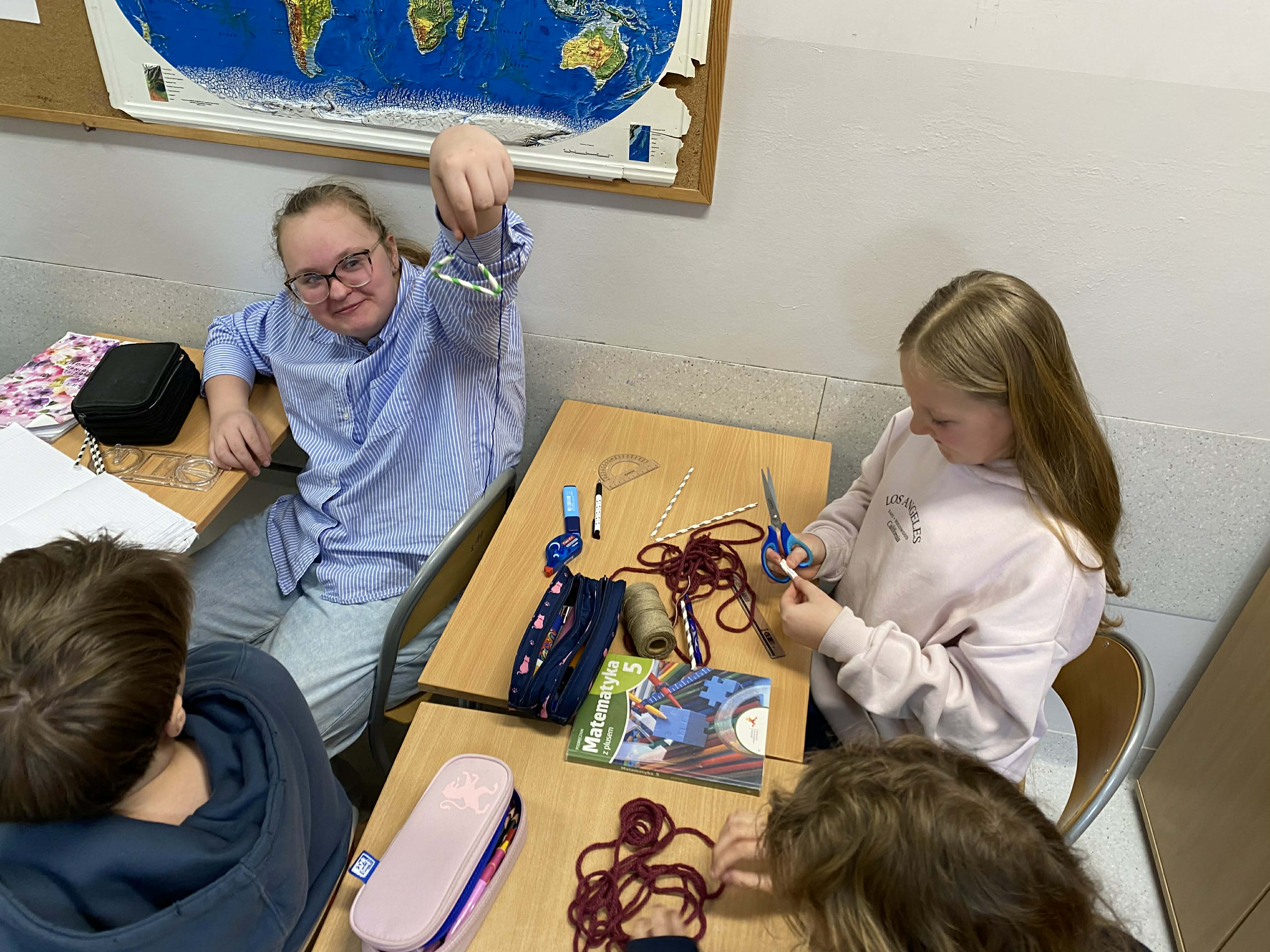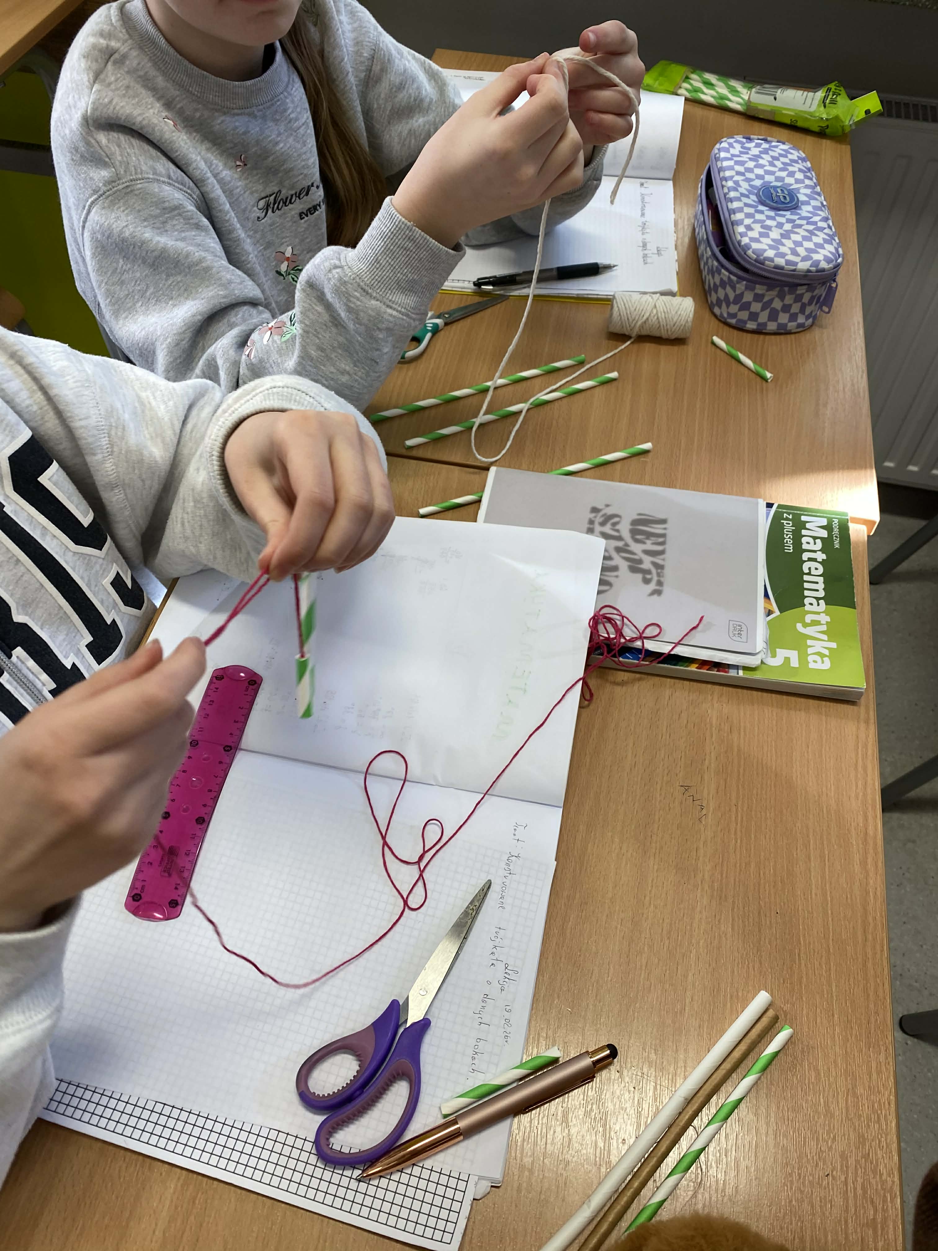 Na dzisiejszej lekcji matematyki klasy 5-te wzięły geometrię w swoje ręce! Zamiast tylko rysować w zeszytach, uczniowie zamienili się w konstruktorów. Używając słomek i sznurka, sprawdzali w praktyce, jak działa konstrukcja trójkąta o danych bokach.