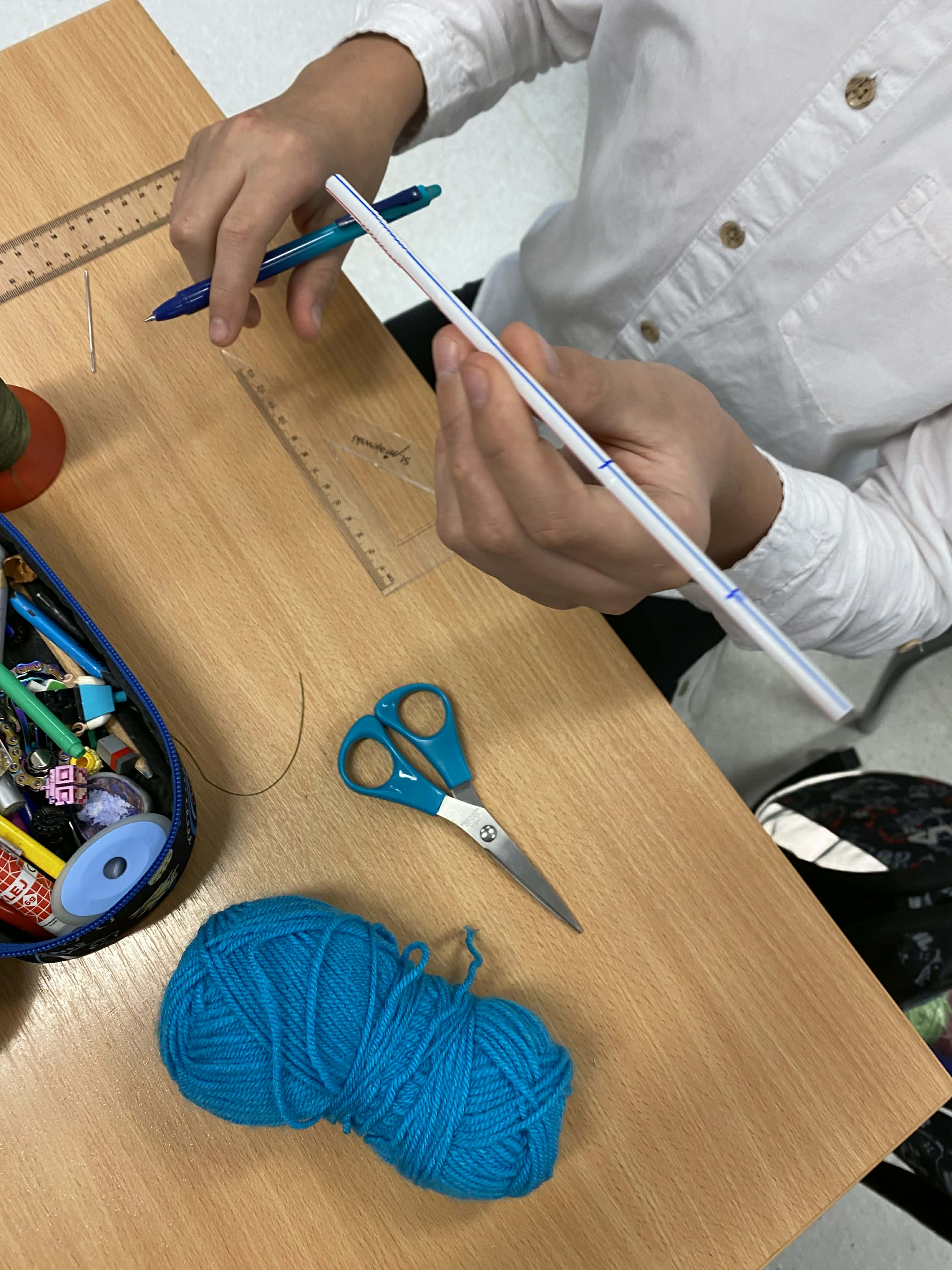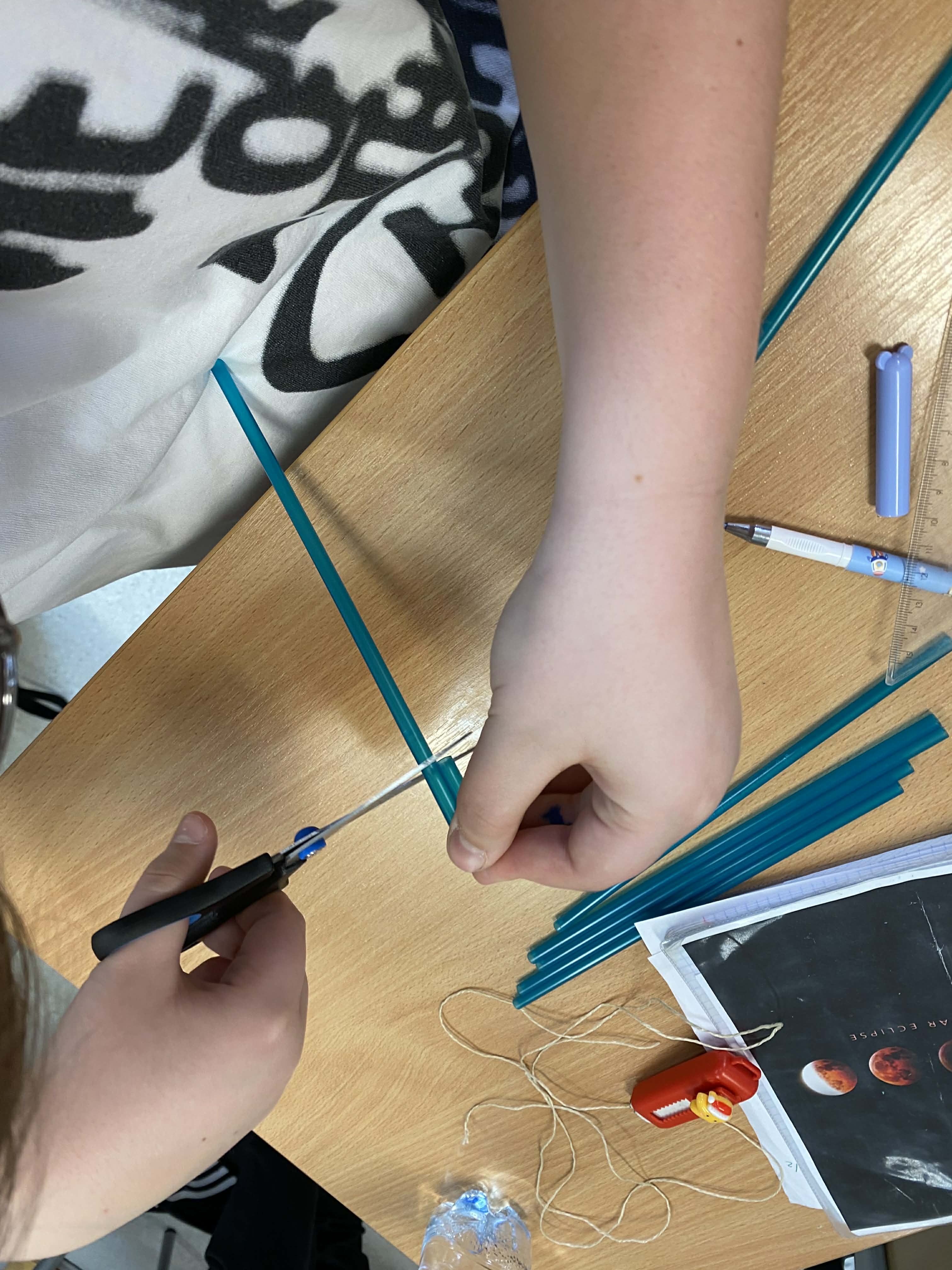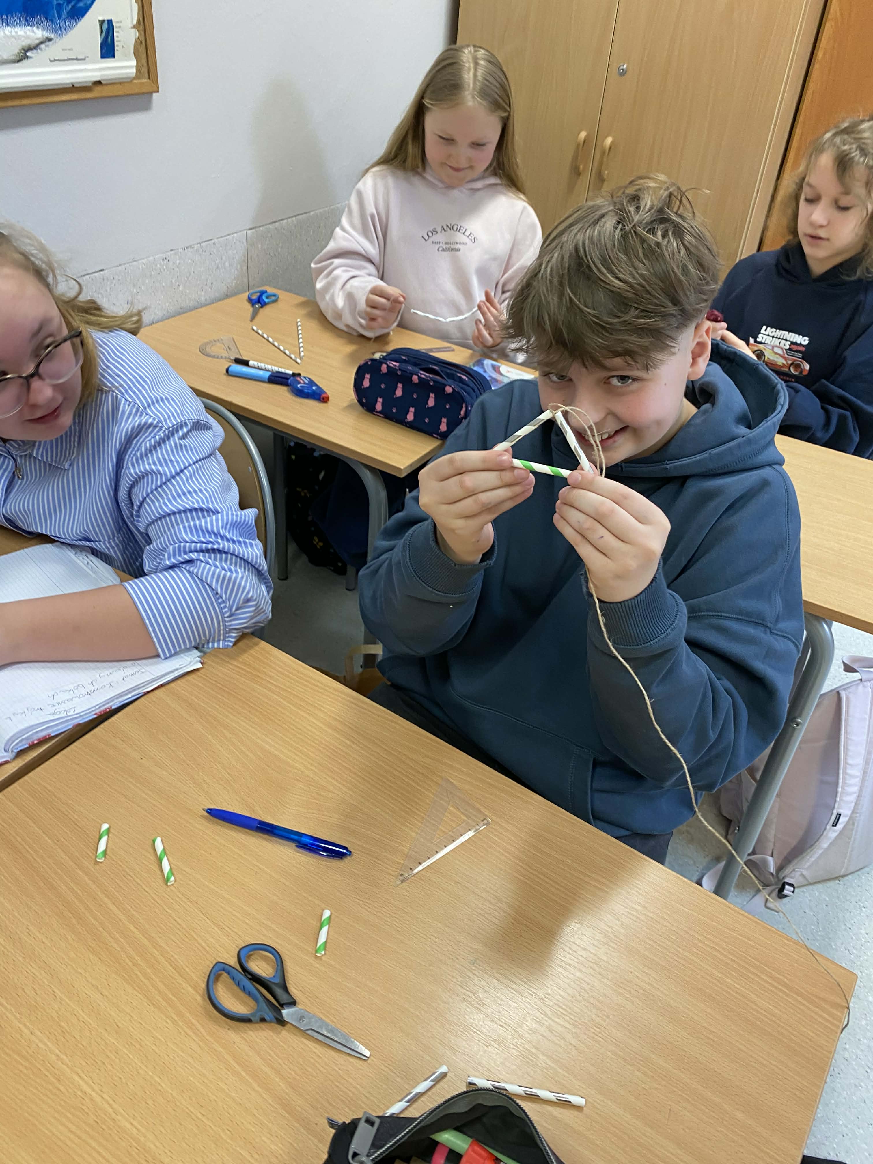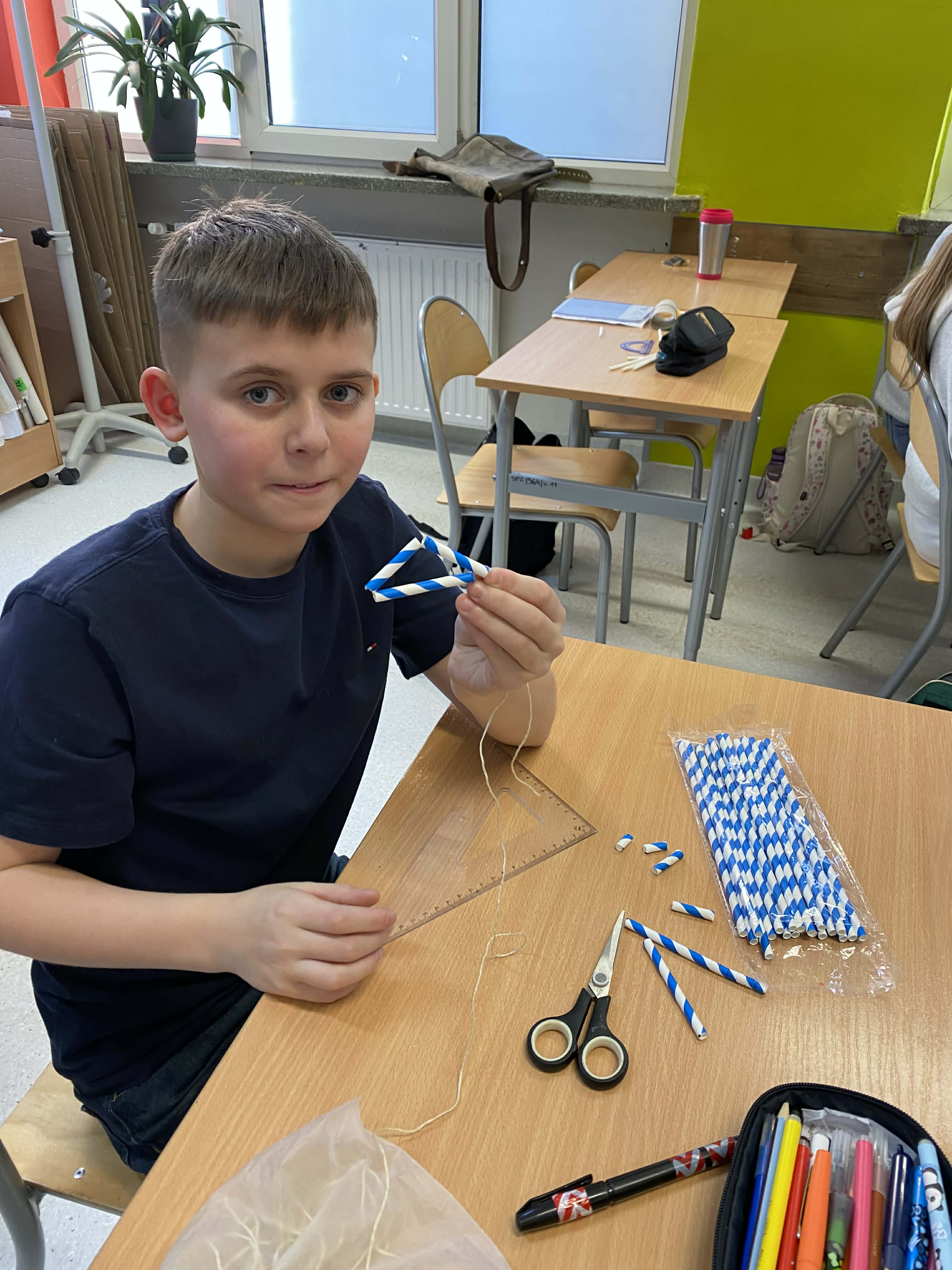 Na dzisiejszej lekcji matematyki klasy 5-te wzięły geometrię w swoje ręce! Zamiast tylko rysować w zeszytach, uczniowie zamienili się w konstruktorów. Używając słomek i sznurka, sprawdzali w praktyce, jak działa konstrukcja trójkąta o danych bokach.