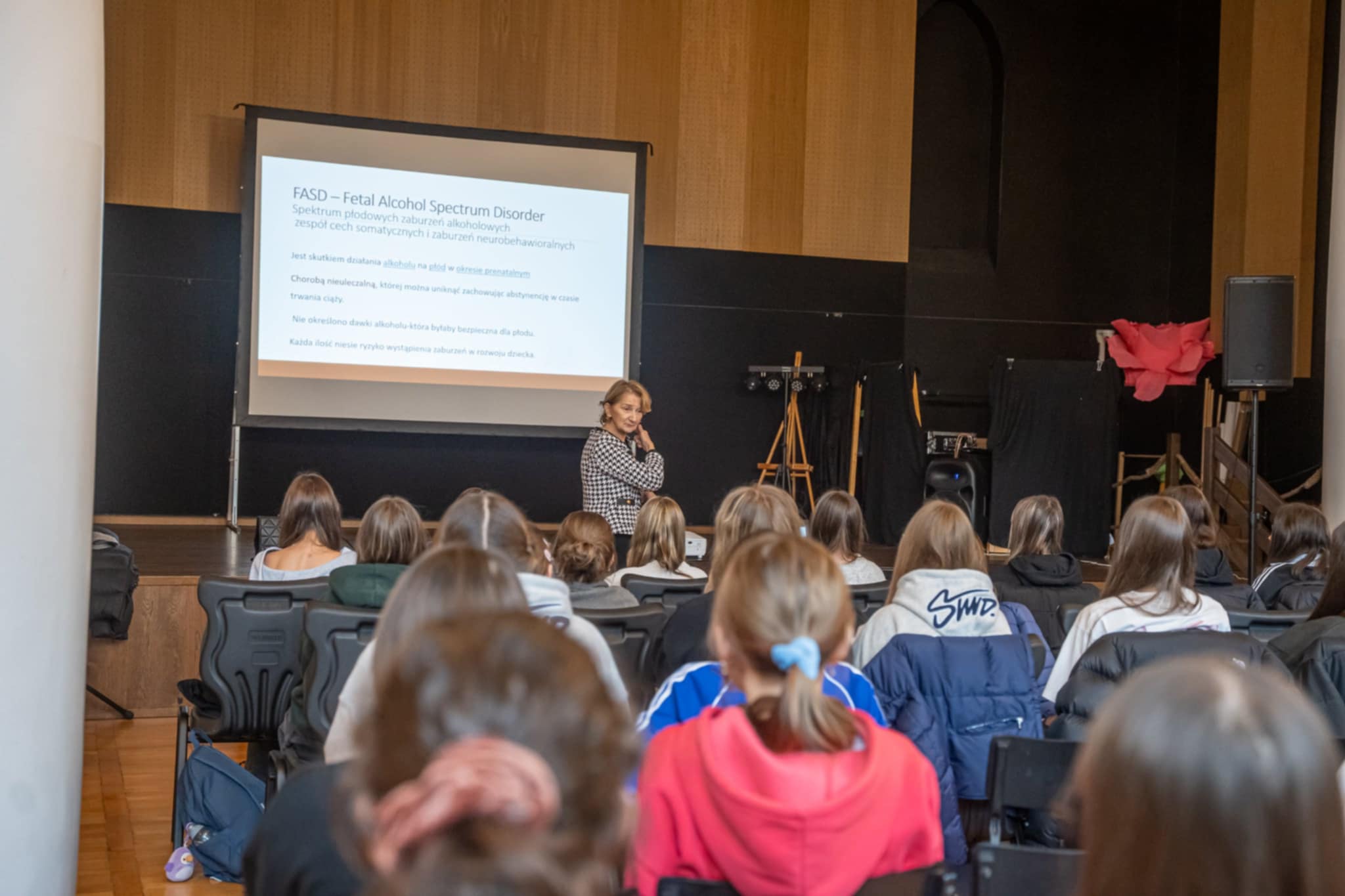 26 listopada uczennice klas ósmych z naszej szkoły, wzięły aktywny udział w warsztatach tematycznych dotyczących wpływu alkoholu na rozwój człowieka. Warsztaty dotyczące FASD- spektrum płodowych zaburzeń alkoholowych poprowadziła dr Ewa Idziakowska – Głuszczak, neonatolog z Kliniki Neonatologii Uniwersyteckiego Centrum Klinicznego Warszawskiego Uniwersytetu Medycznego.