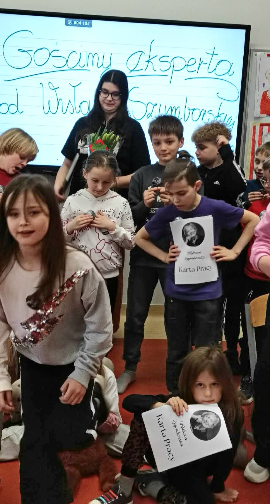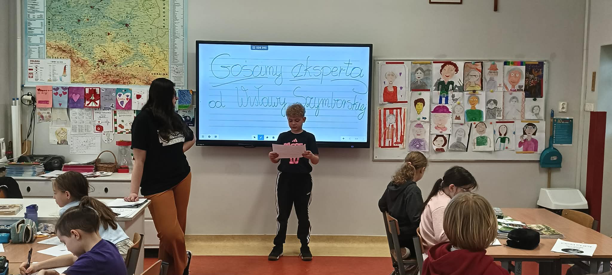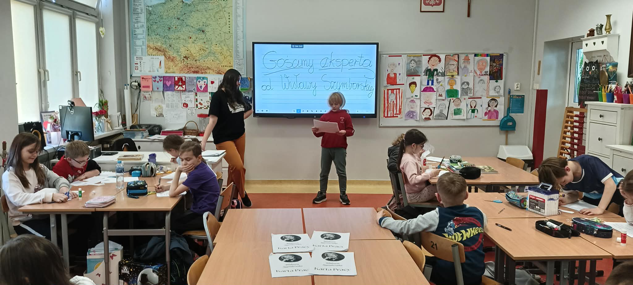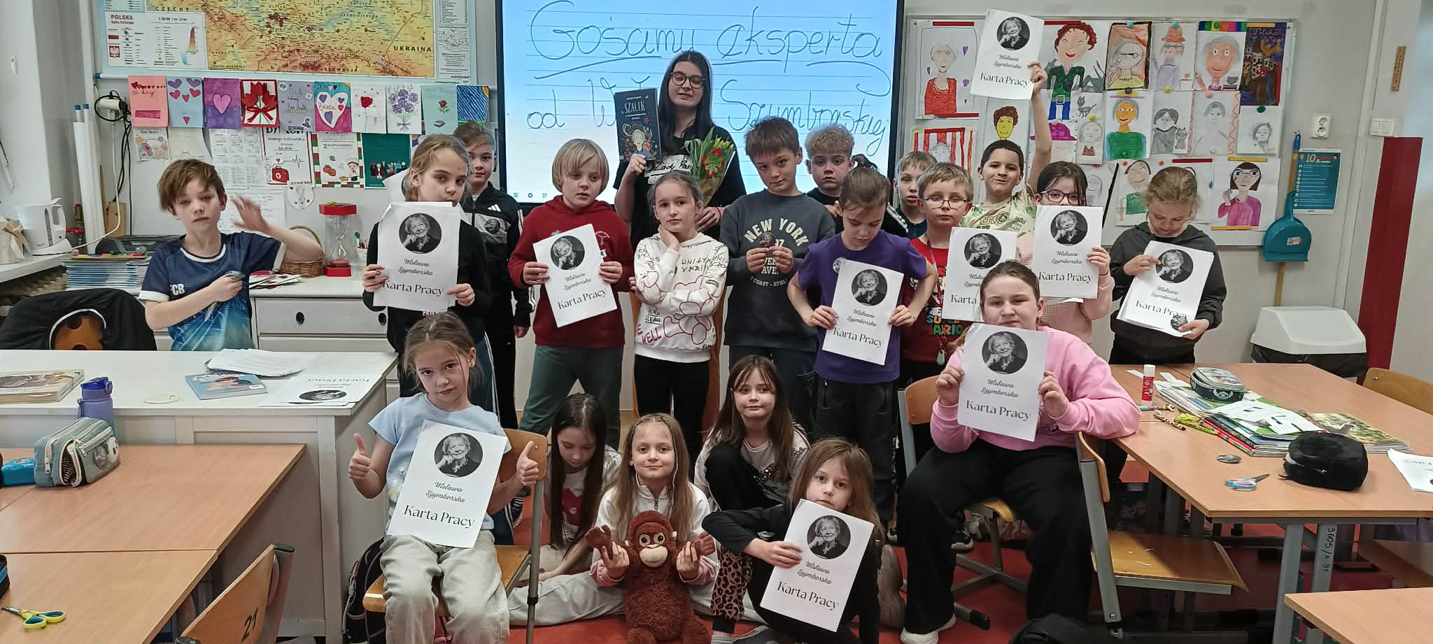 Pani Nikola przybyła na spotkanie z wyjątkową książką dla dzieci o poetce Wisławie Szymborskiej pt."Szalik" autorstwa Michała Rusinka, promując tym samym pasję i wartość czytania. Między kolejne ciekawostki z książki, dotyczące dzieciństwa, młodości i dorosłego życia Noblistki, Pani Nikola wplatała dzieciom literackie zadania, ukryte na kartach pracy. Była to okazja do twórczej zabawy w oparciu o bank wyrazów i redagowania zabawnych opowiadań. Za wysoki poziom zaangażowania w słuchanie, czytanie i pisanie oraz wiedzę, Pani Nikola nagrodziła każde dziecko pamiątkową przypinką z wizerunkiem p. Wisławy, a całą klasę wzruszającą książką pt. "AdoPsiak Biszkopt" autorstwa Łukasza Litewki.