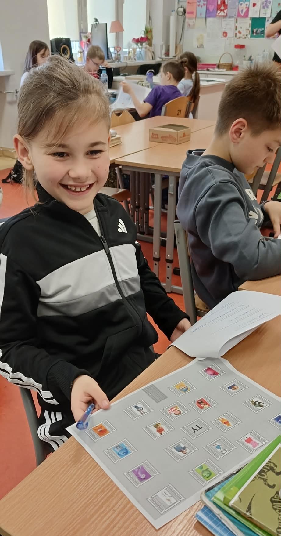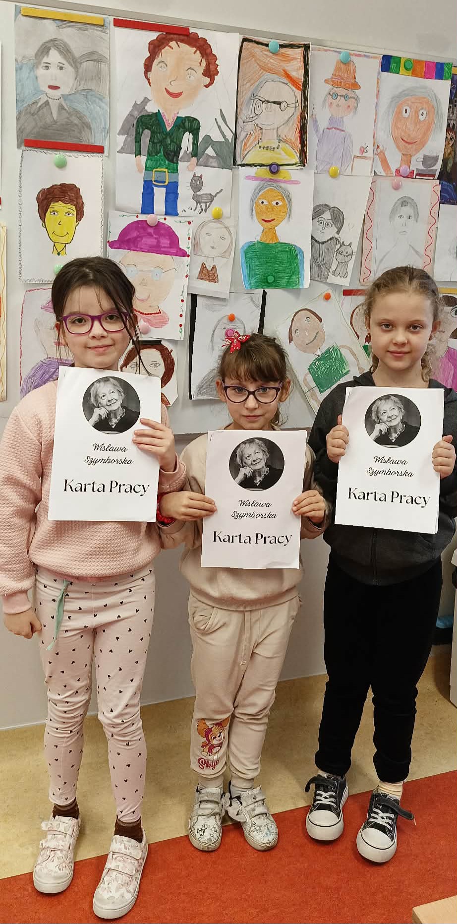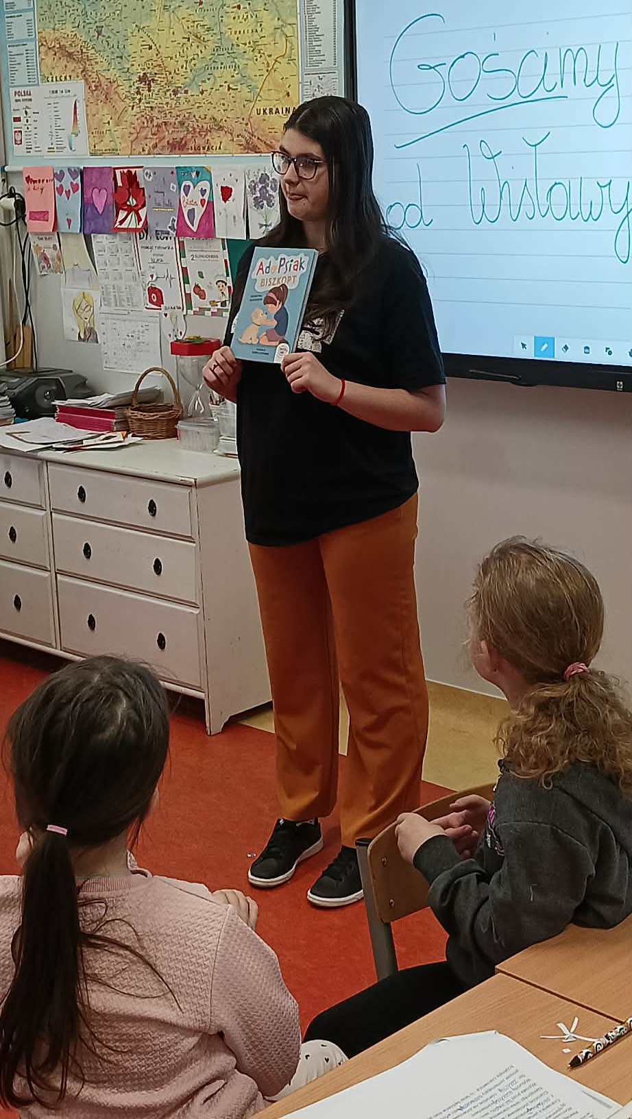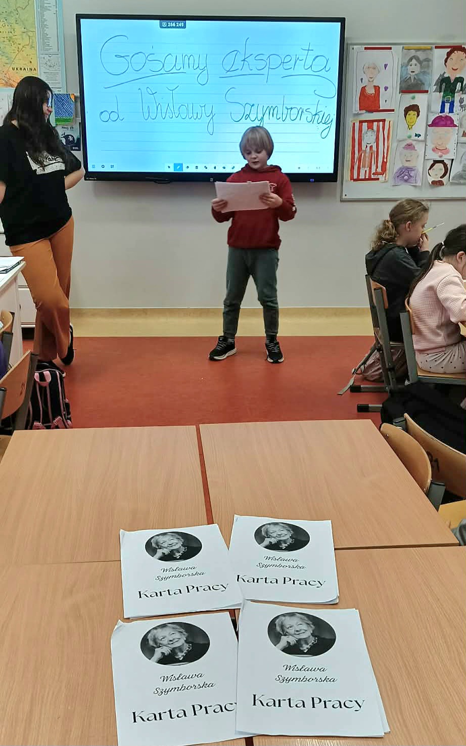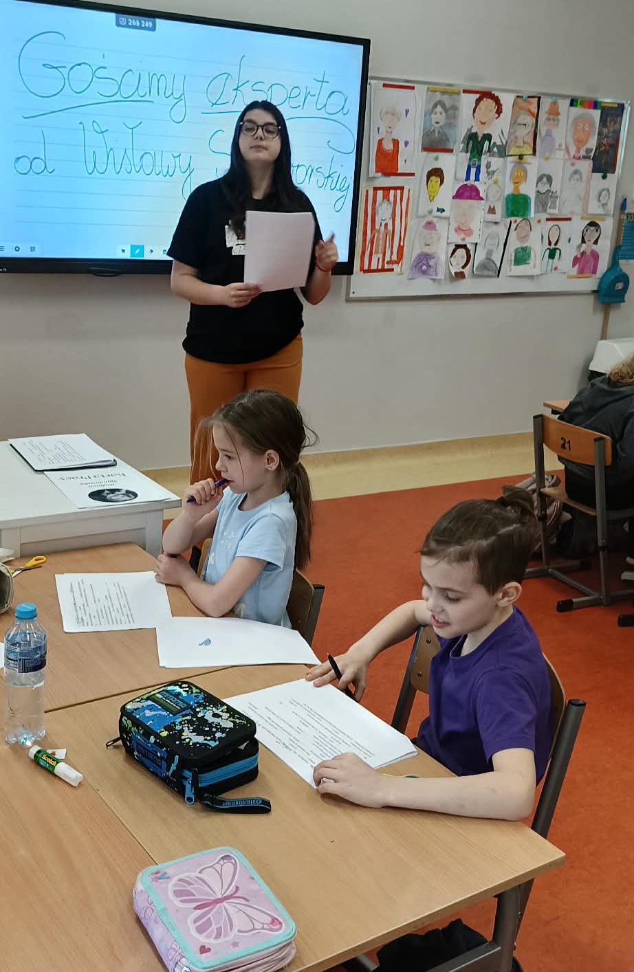Pani Nikola przybyła na spotkanie z wyjątkową książką dla dzieci o poetce Wisławie Szymborskiej pt."Szalik" autorstwa Michała Rusinka, promując tym samym pasję i wartość czytania. Między kolejne ciekawostki z książki, dotyczące dzieciństwa, młodości i dorosłego życia Noblistki, Pani Nikola wplatała dzieciom literackie zadania, ukryte na kartach pracy. Była to okazja do twórczej zabawy w oparciu o bank wyrazów i redagowania zabawnych opowiadań. Za wysoki poziom zaangażowania w słuchanie, czytanie i pisanie oraz wiedzę, Pani Nikola nagrodziła każde dziecko pamiątkową przypinką z wizerunkiem p. Wisławy, a całą klasę wzruszającą książką pt. "AdoPsiak Biszkopt" autorstwa Łukasza Litewki.