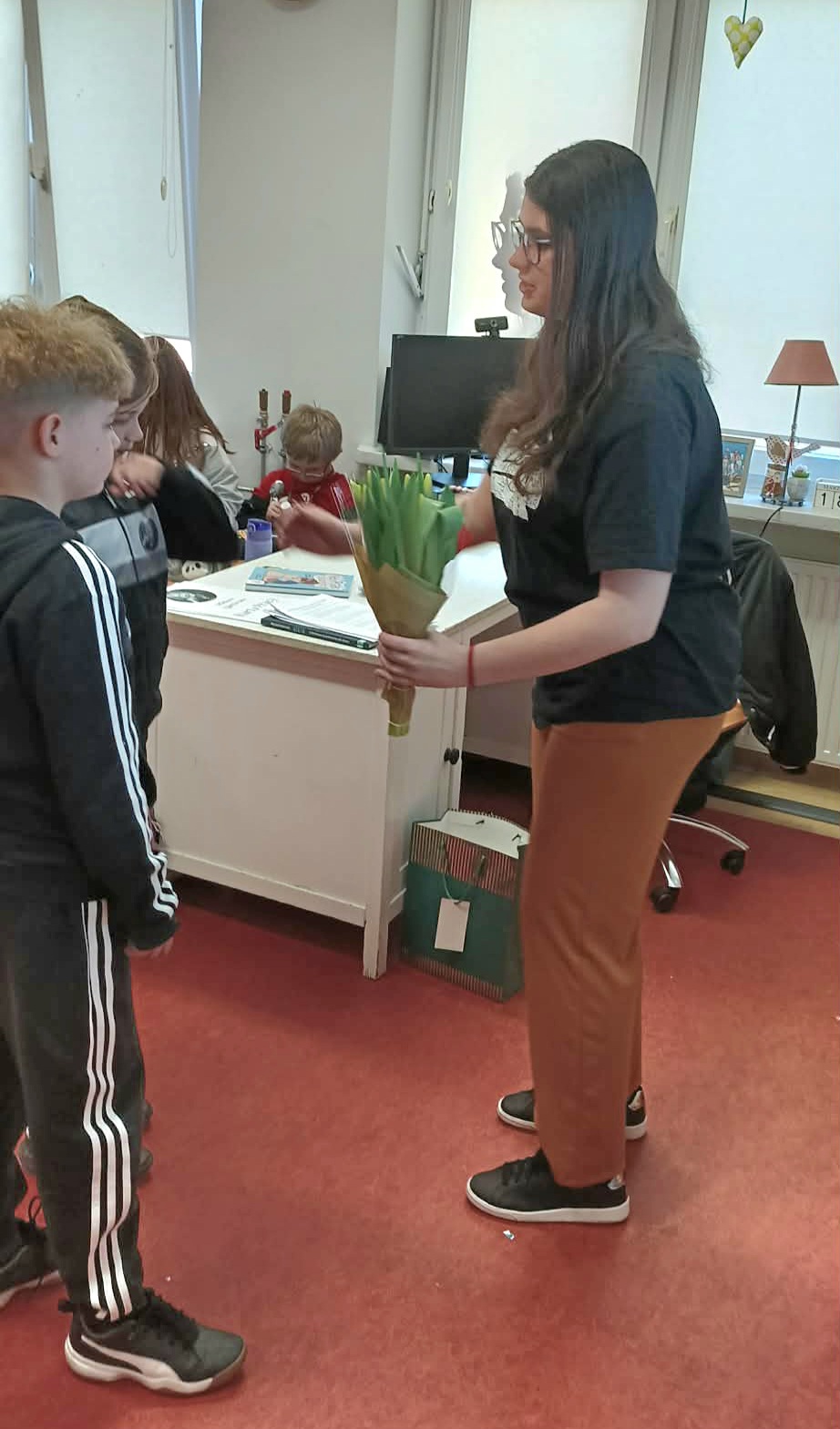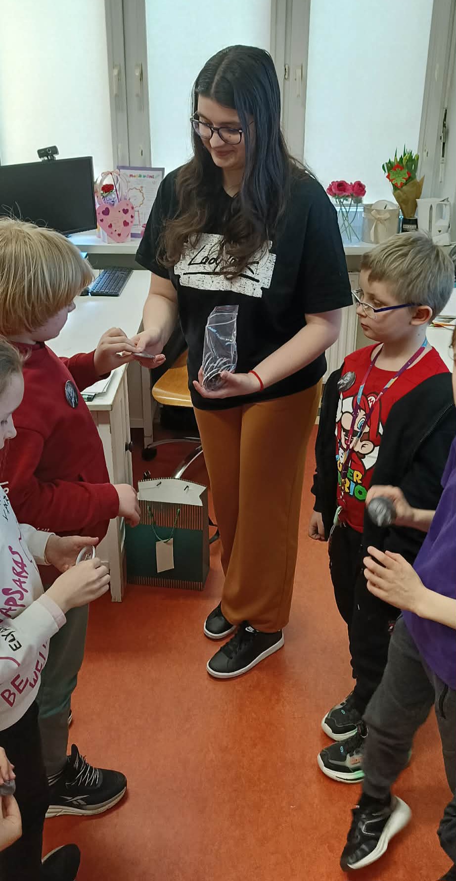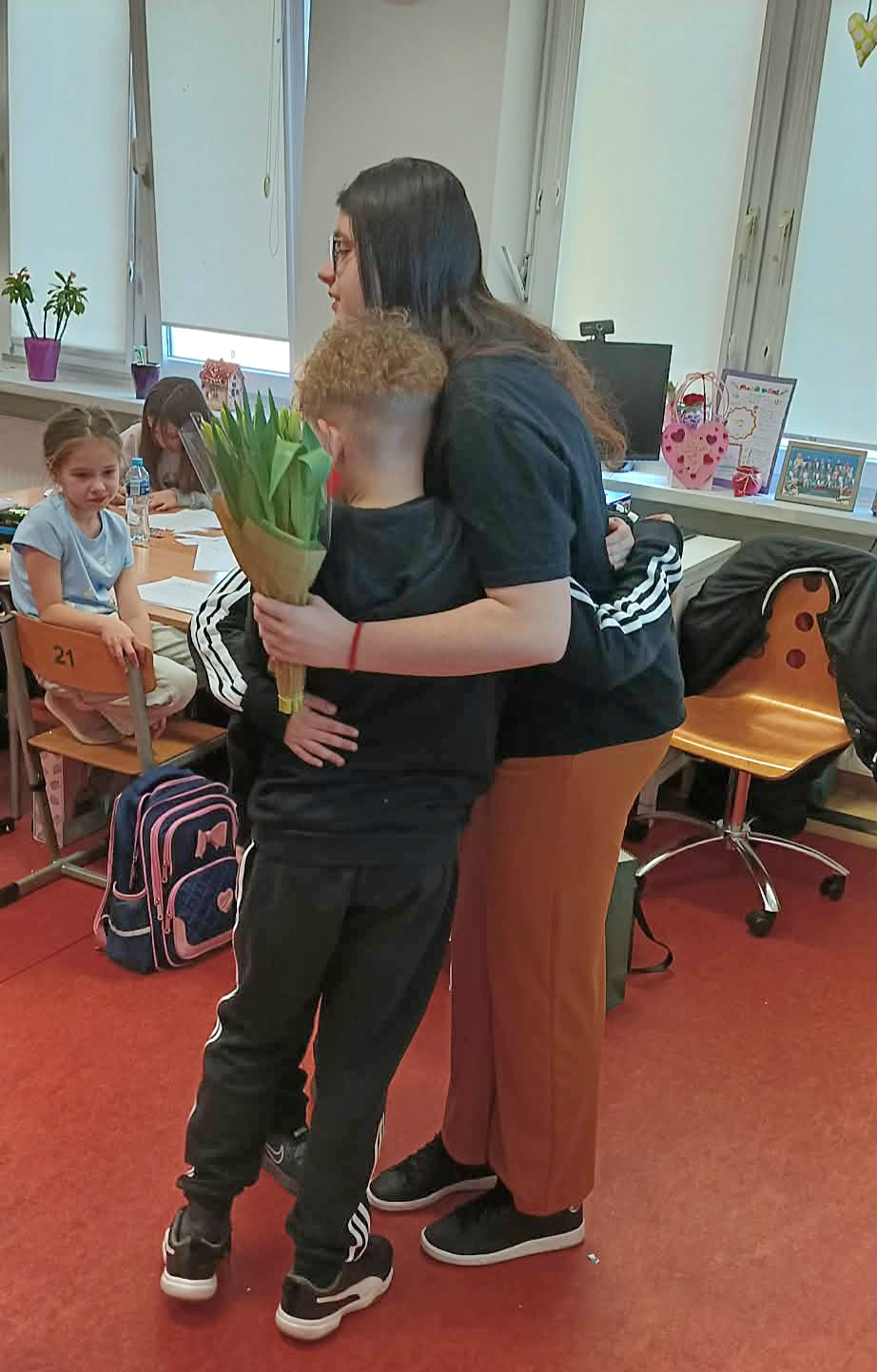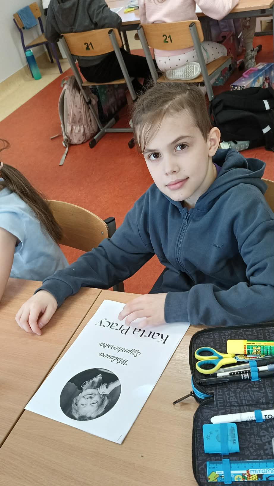 Pani Nikola przybyła na spotkanie z wyjątkową książką dla dzieci o poetce Wisławie Szymborskiej pt."Szalik" autorstwa Michała Rusinka, promując tym samym pasję i wartość czytania. Między kolejne ciekawostki z książki, dotyczące dzieciństwa, młodości i dorosłego życia Noblistki, Pani Nikola wplatała dzieciom literackie zadania, ukryte na kartach pracy. Była to okazja do twórczej zabawy w oparciu o bank wyrazów i redagowania zabawnych opowiadań. Za wysoki poziom zaangażowania w słuchanie, czytanie i pisanie oraz wiedzę, Pani Nikola nagrodziła każde dziecko pamiątkową przypinką z wizerunkiem p. Wisławy, a całą klasę wzruszającą książką pt. "AdoPsiak Biszkopt" autorstwa Łukasza Litewki.