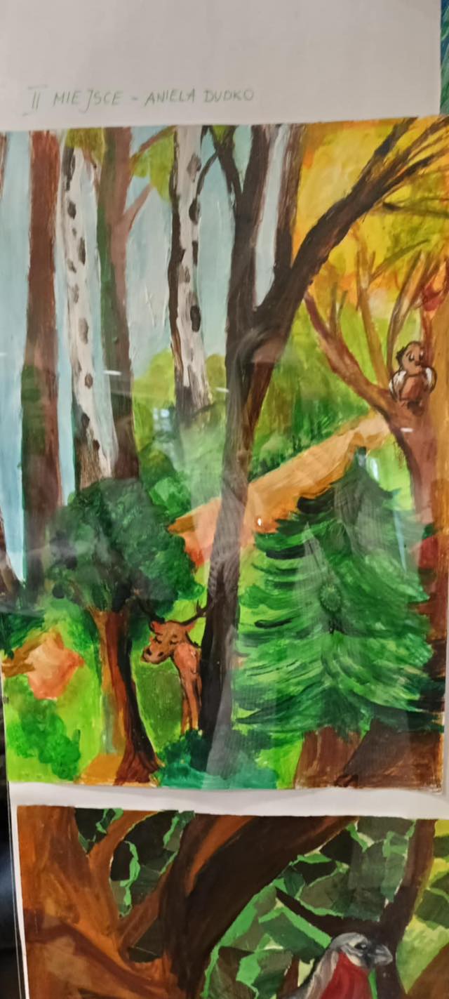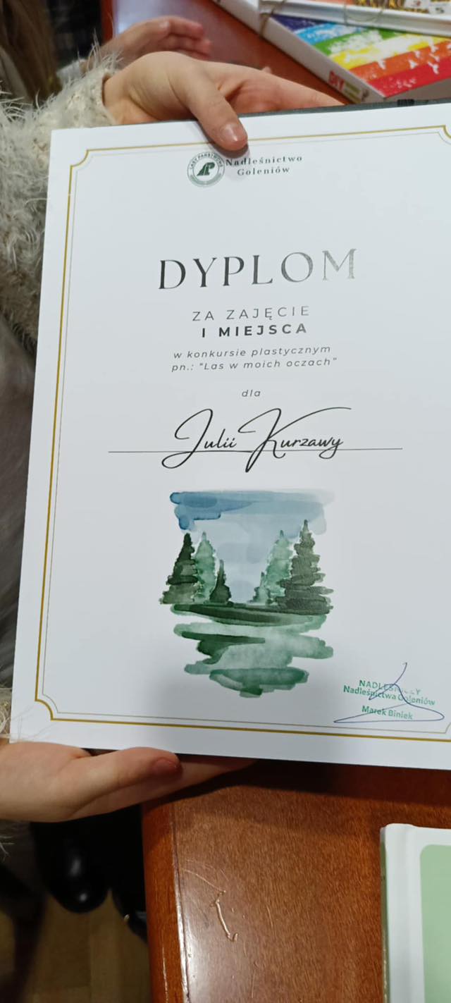 "LAS W MOICH OCZACH" to konkurs plastyczny zorganizowany przez Nadleśnictwo Goleniów, którego podsumowanie odbyło się w siedzibie Nadleśnictwa, przy ul.Parkowej 1, 18 grudnia. Można śmiało powiedzieć, że dla naszej szkoły wysypał się prawdziwy worek z prezentami, bo Laureatkami w konkursie zostało aż sześć dziewcząt, które przepięknie przedstawiły wymalowały i wykleiły "las swoimi oczami ".