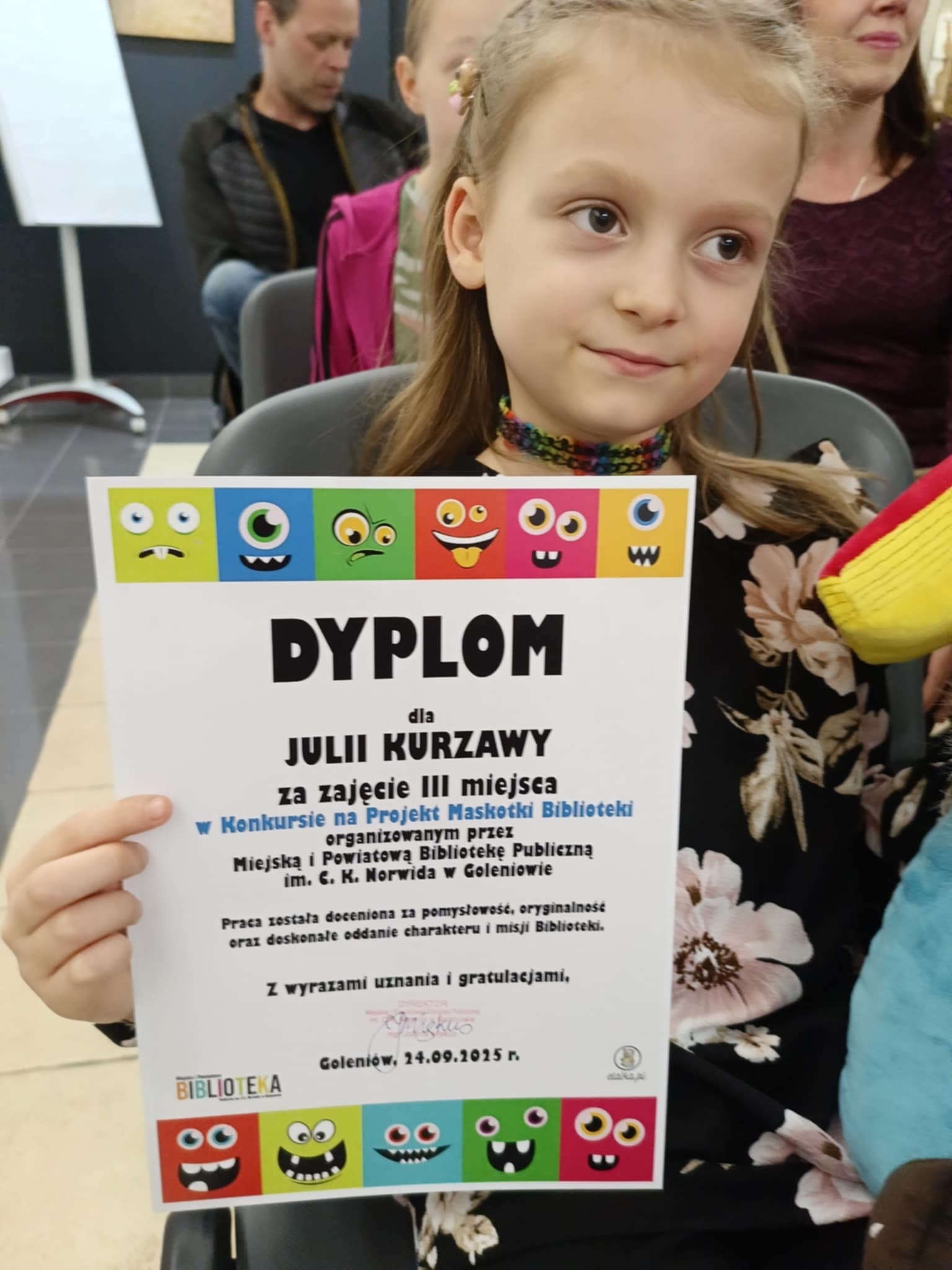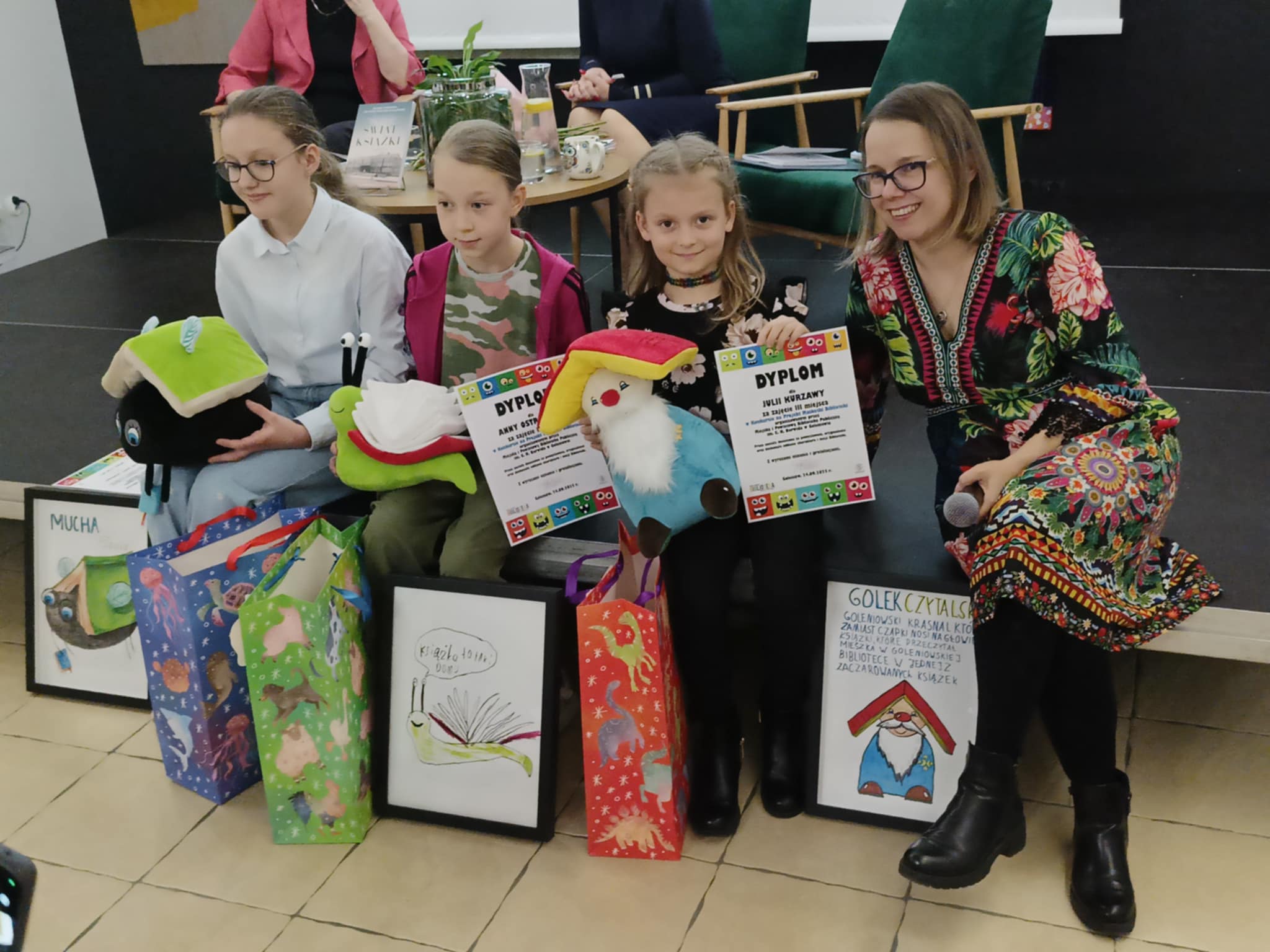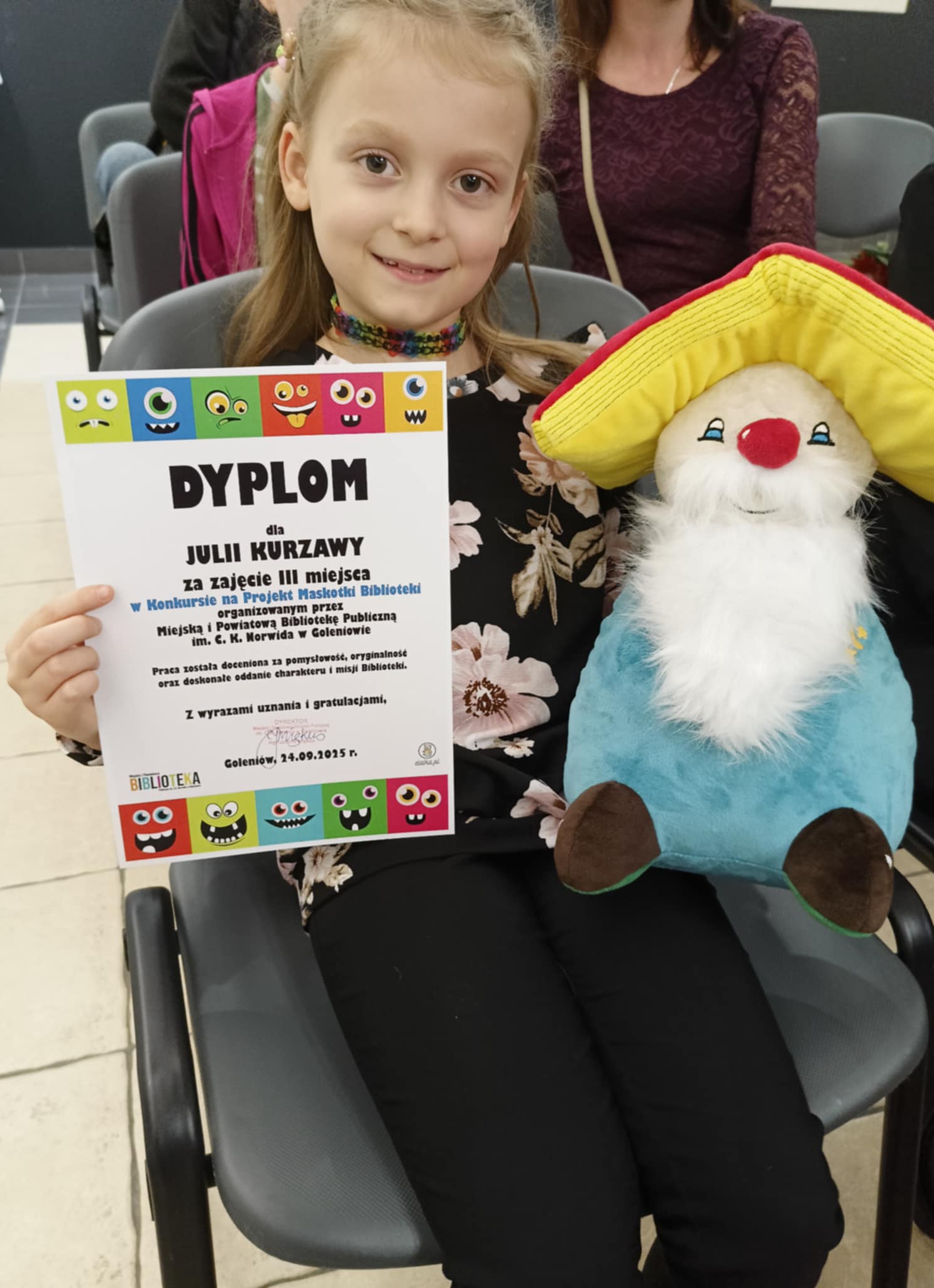 W czwartkowy wieczór, 9 października, w sali wystawowej Miejskiej i Powiatowej Biblioteki Publicznej im. C.K. Norwida w Goleniowie, wśród zgromadzonych gości, odbyły się dwa wyjątkowe wydarzenia: wręczenie nagród trzem laureatom w Konkursie na Projekt Maskotki Biblioteki oraz promocja książki autorstwa pani Marii Palicy pt. "Świat książki", opowiadającej o historii naszej Biblioteki. Oba te wydarzenia były wyjątkowe, bo odbyły się w historii Goleniowa poraz pierwszy. Utalentowana i pracowita JULIA KURZAWA wraz z kolegą OLKIEM KRASZKIEWICZEM (oboje z klasy 2b) podjęli jeszcze przed wakacjami wyzwanie i wysłali na konkurs swoje projekty. Łącznie wpłynęło 50 propozycji przyszłej maskotki, ale to Krasnal GOLEK Julci został dostrzeżony, doceniony i nagrodzony tytułem laureata lll miejsca. Znalazł się tym samym w bardzo ścisłym gronie równie ciekawych i uszytych maskotek - Ślimaka z książką jako domkiem (miejsce ll) i Muchy z książką (miejsce l). Wszystkie trzy maskotki wzbudziły podziw i zachwyt publiczności, a przede wszystkim samych laureatek i ich bliskich.