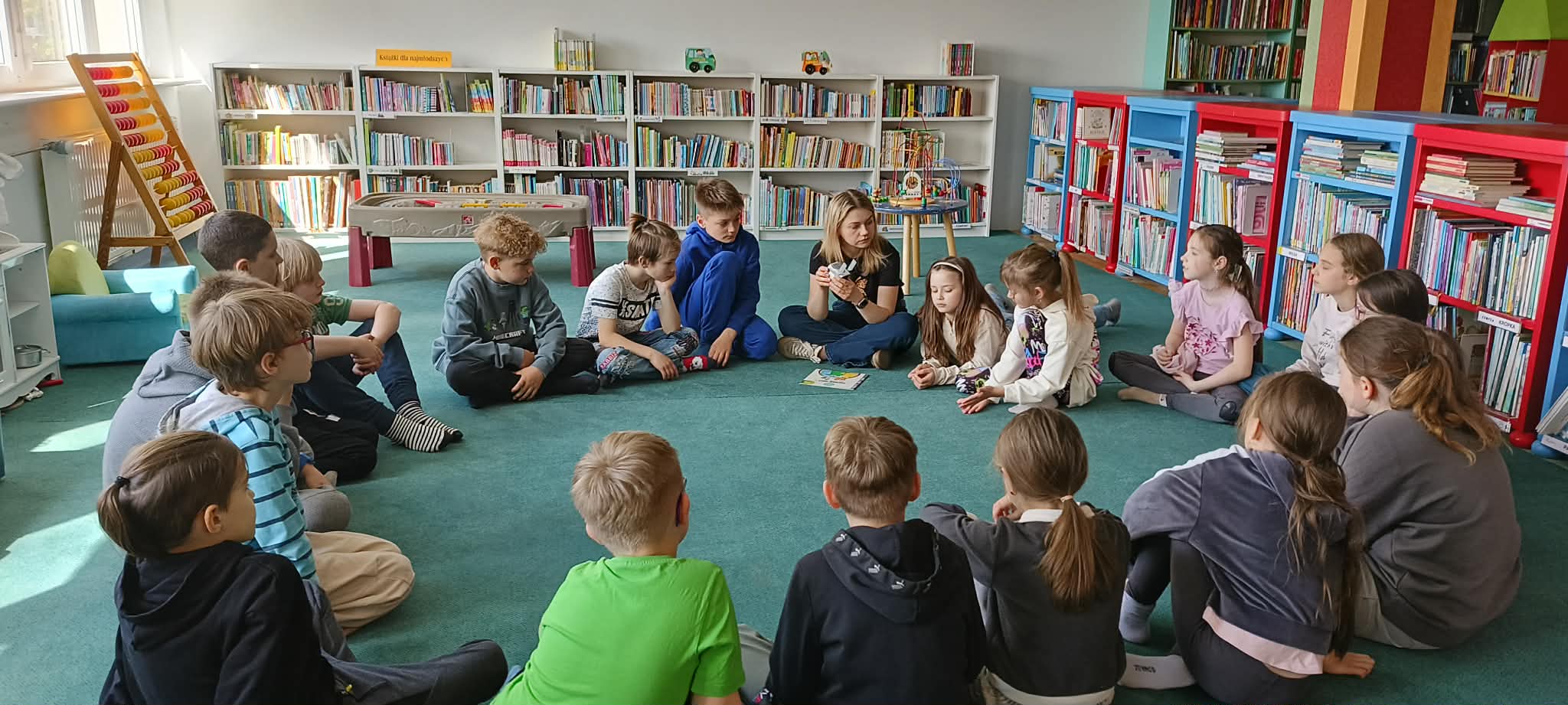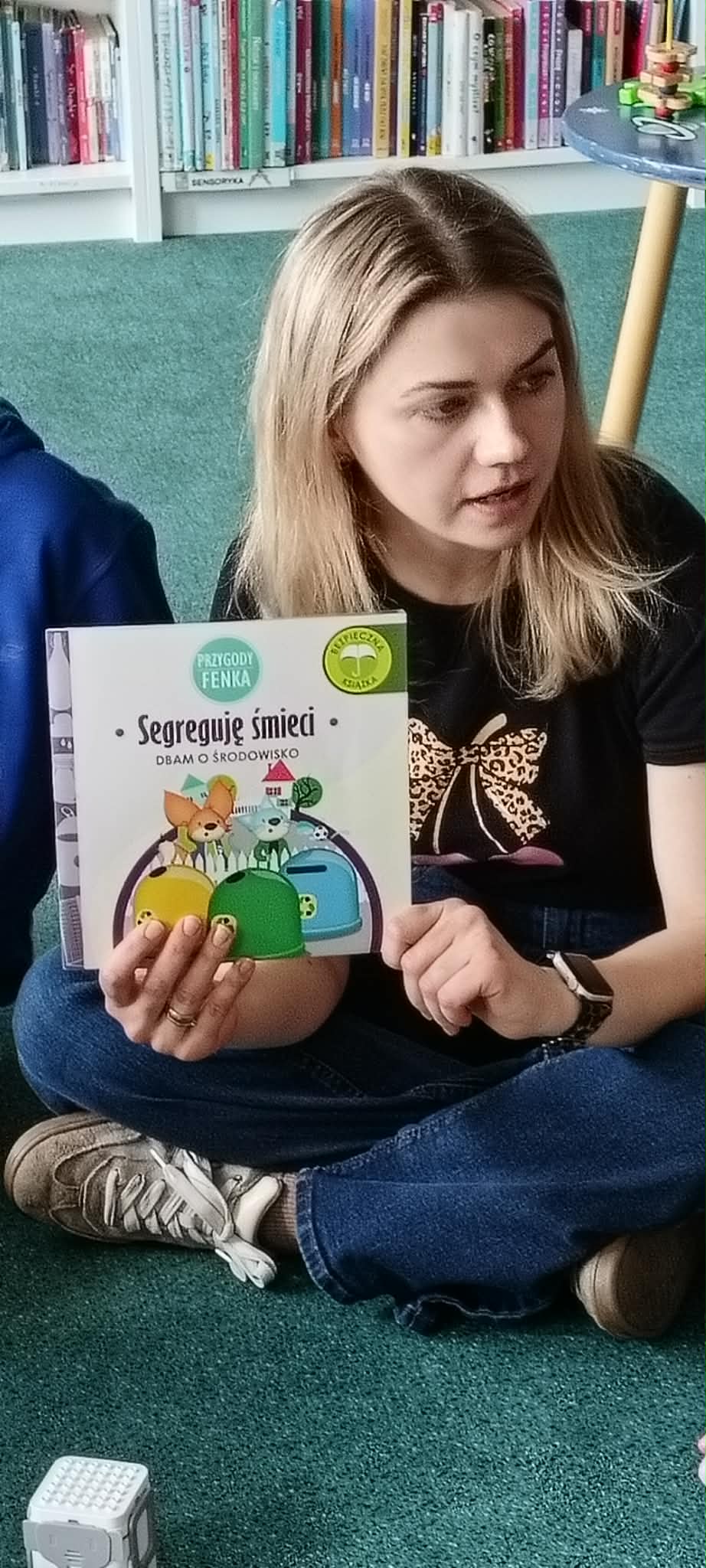 Tradycyjnie spotkanie rozpoczęło się w kręgu od wysłuchania fragmentu książki. Opowieść o przygodach Fenka pt. „Segreguję śmieci. Dbam o środowisko” była doskonałą okazją do powtórzenia wiadomości ekologicznych – dzieci przypomniały sobie kolory pojemników oraz zasady właściwej segregacji odpadów z gospodarstwa domowego.