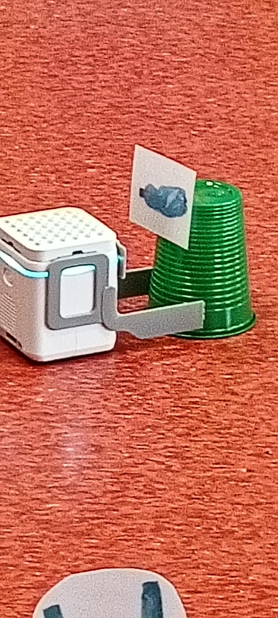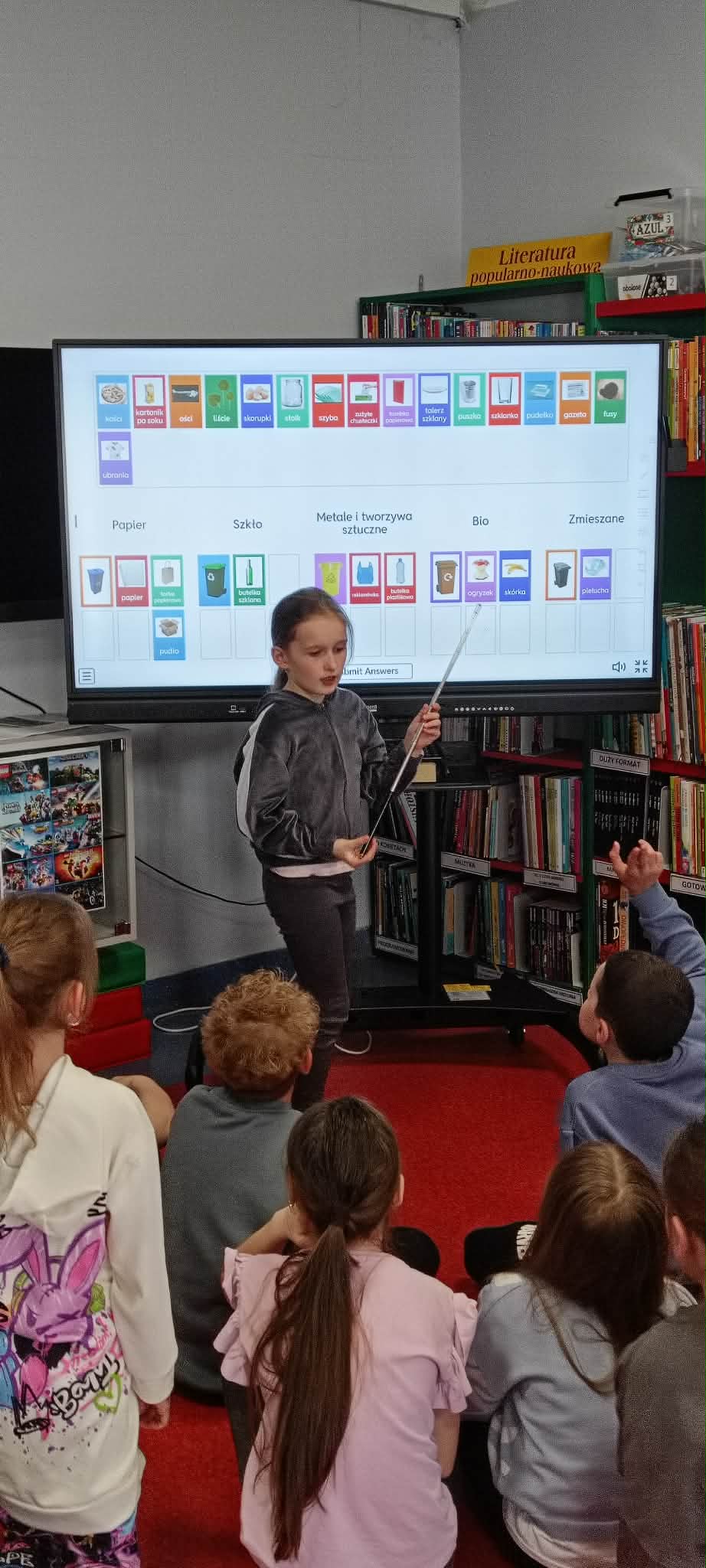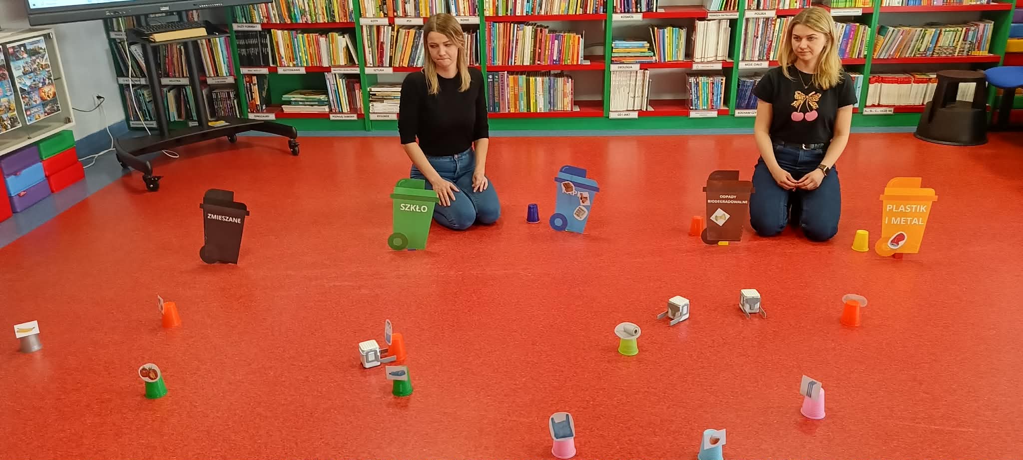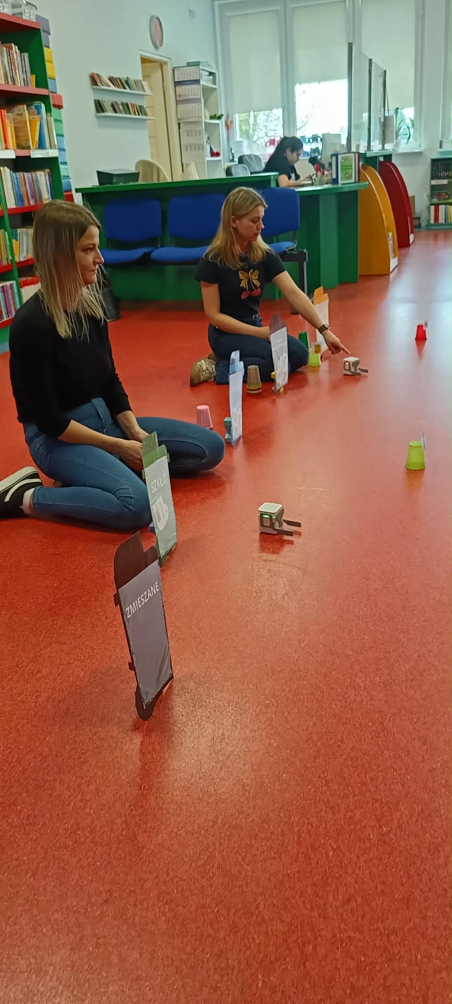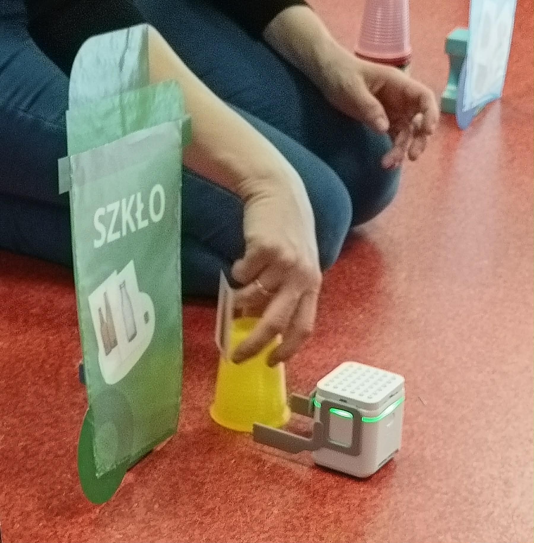 Po matematycznym podziale na grupy uczniowie przystąpili do pracy z edukacyjnymi robotami GaniBot. Ich zadaniem było sterowanie nimi jak miniśmieciarkami i zebranie odpowiednich odpadów do właściwych kontenerów oznaczonych jako: szkło, papier, plastik, zmieszane lub bio.